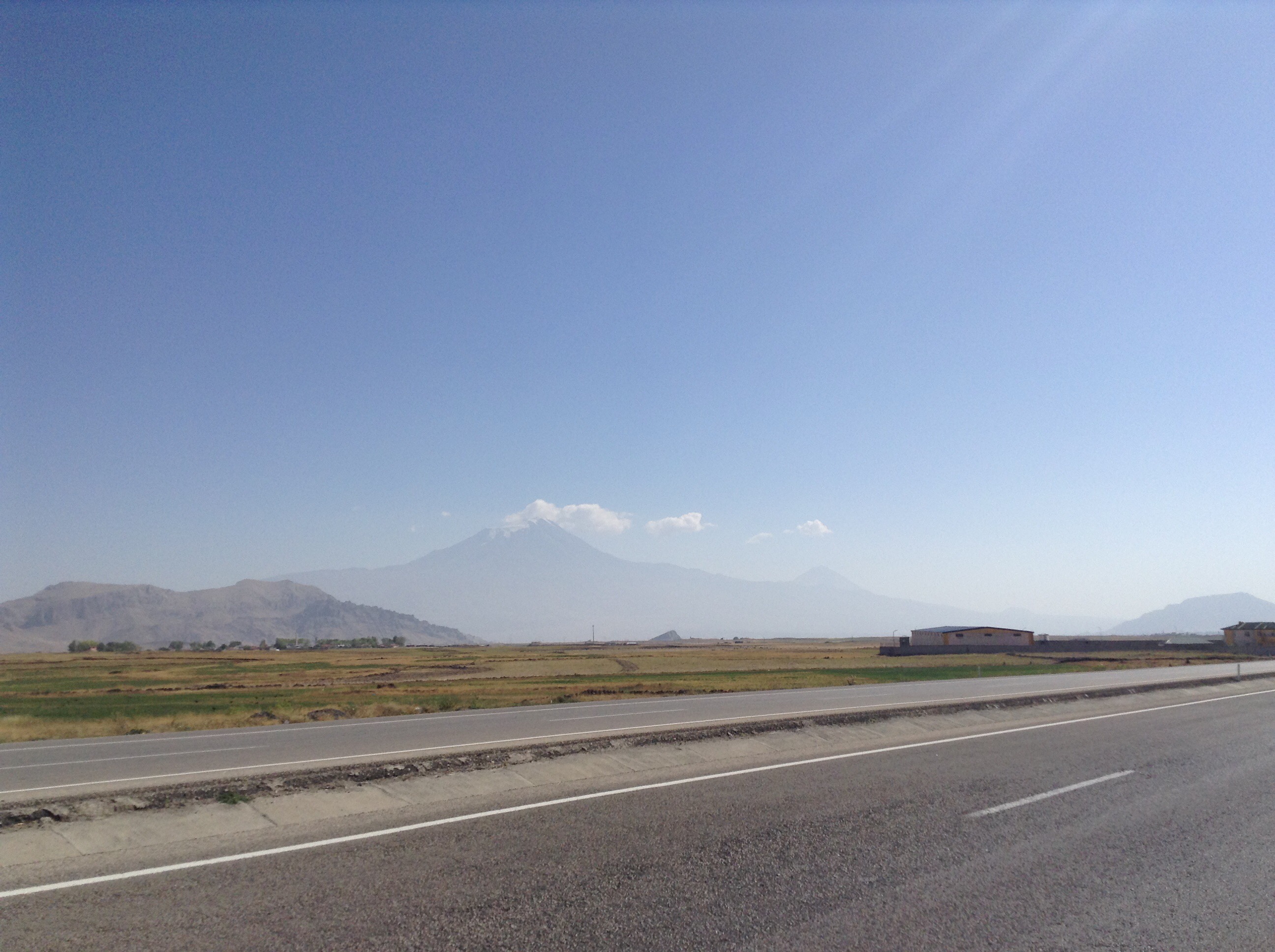 Es lagen noch 100 km vor mir. Hier ein Blick auf den Ararat. Man kann ihn in der Ferne erahnen. Es ist der mit der großen Wolke darüber, rechts daneben der kleine Ararat. Noah läßt grüßen!