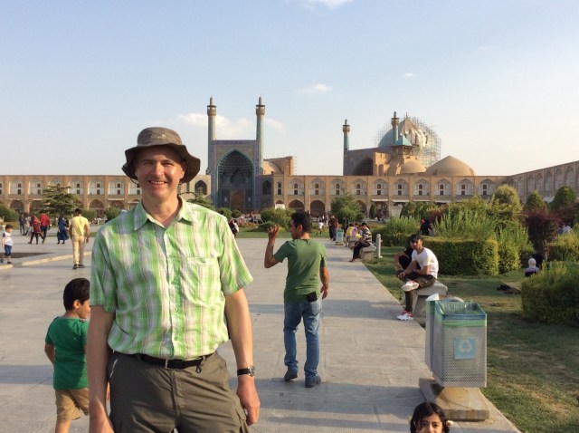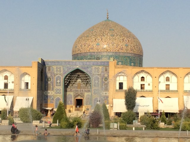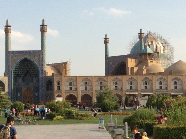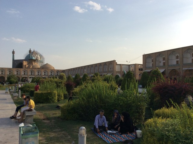 Gestern aus der Wüste gekommen, enthüllt sich heute morgen wahrlich ein Paradies in einem bisher sehr trockenen Land. Aufgrund der Höhe von 1.800 Metern und der Nähe zu den Bergen, verfügt Isfahan auch im Spätsommer noch über genügend Wasserreserven in unterirdischen Kavernen. Zwar sind alle Flüsse ausgetrocknet, aber die Parks und Gärten sind satt grün. Das Paradies hat sich an dieser Stelle, aber auch in Form von monumentalen Bauten, manifestiert.