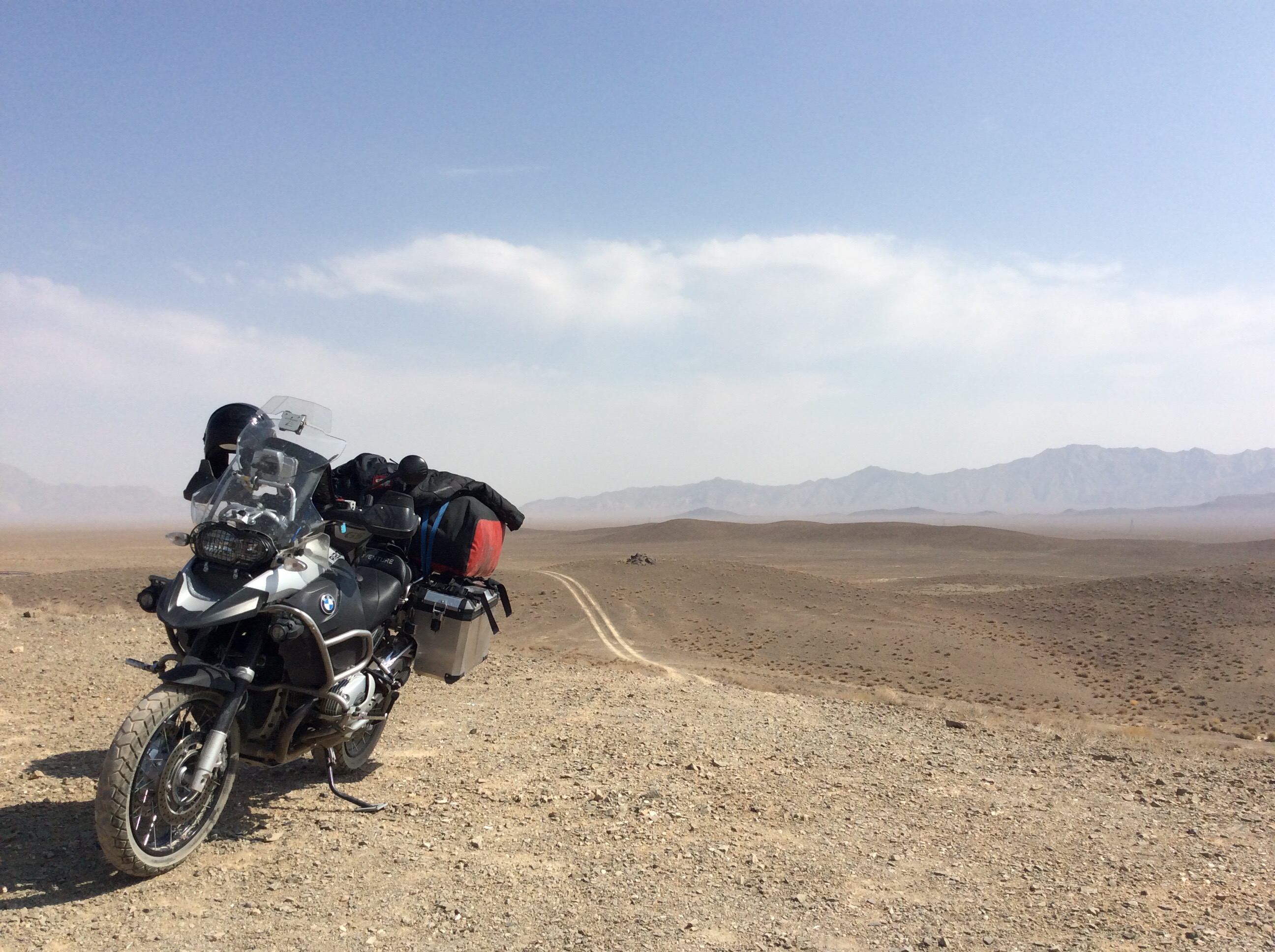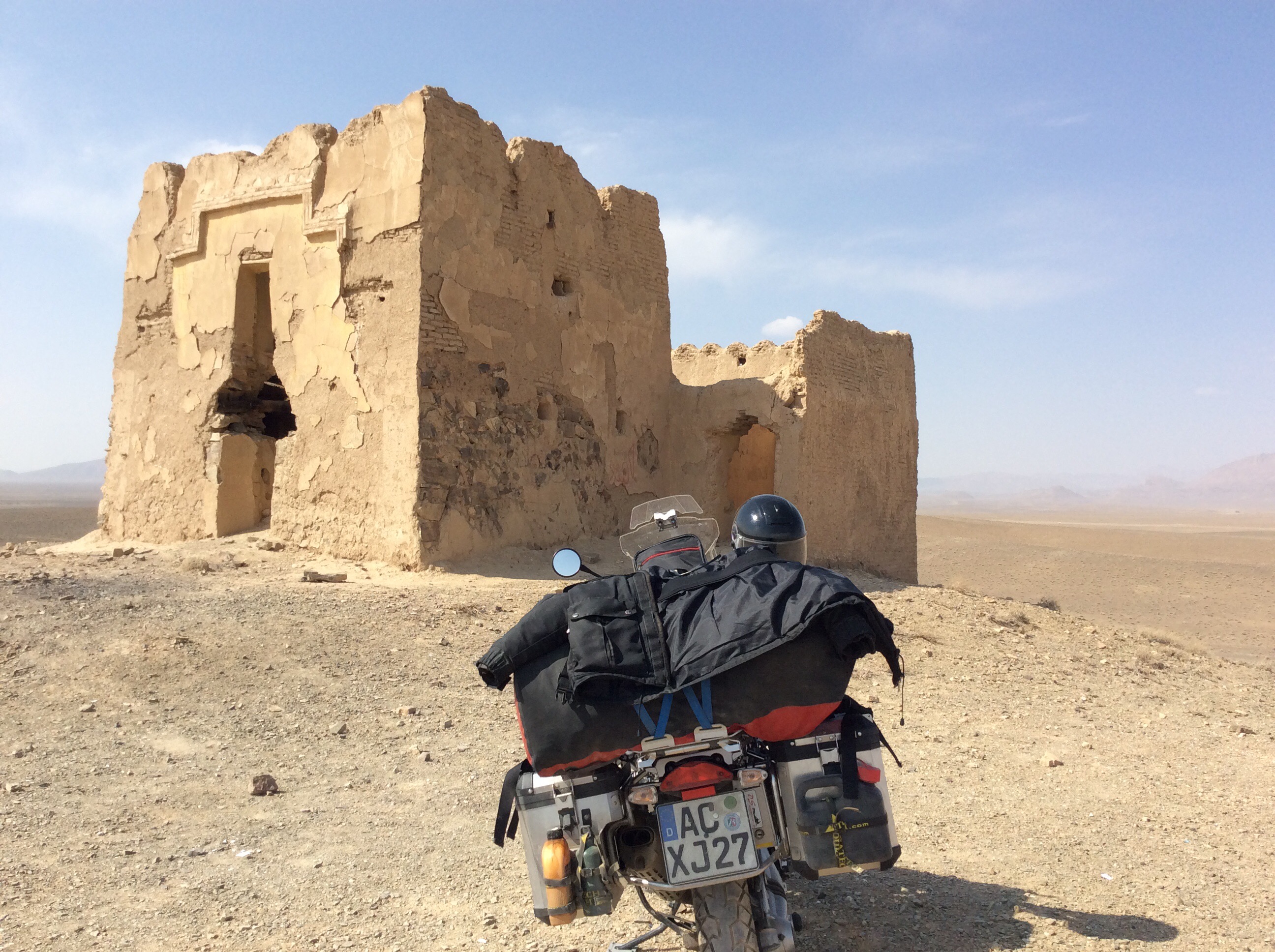 Ich durfte somit 30 Minuten in der prallen Sonne stehen bis man endlich das Tor öffnete und mir ein „Wellcome“ entgegen schmetterte. Schnell die Maschine an und 15 Meter vor. Was jetzt folgte war etwas undurchsichtig. Keine Personen in Uniform, aber zig Leute die um einen rummachen und nach den Papieren fragen. Ich also brav meinen Pass und das Carnet abgegeben und schwups war einer mit den Unterlagen im Zollgebäude. Zu diesem Zeitpunkt war mir klar, dass dies ein Vermittler war und ich die dicke Rechnung später noch präsentiert bekommen würde. Eine zweite Person frage nach, ob ich denn eine Versicherung für den Iran hätte. Klar hatte ich die grüne Versicherungskarte – auch gültig für den Iran dabei. Als man mir dann aber eröffnete, dass diese nicht gültig sei, wusste ich, dass ich bei diesen Herrschaften Vorsicht walten lassen sollte. Wir einigten uns darauf, dass meine Karte gültig sei, ihren Einwurf, dass ich Schwierigkeiten bekommen würde ignorierte ich einfach, denn dazu stand ich ja schon schließlich lange genug in der prallen Sonne 😜. Einen weiteren Versuch zum Geldwechsel wehrte ich mit dem Verweis ab, dass ich zuerst die Papiere zurück erhalten wollte und max. TRL verhandelbar wären. Diese könnte ich sowieso nur bei meinem netten Betreuer tauschen, da im Iran angeblich keine TRL getauscht würden – klar doch,  die haben mich für ziemlich doof eingestuft.