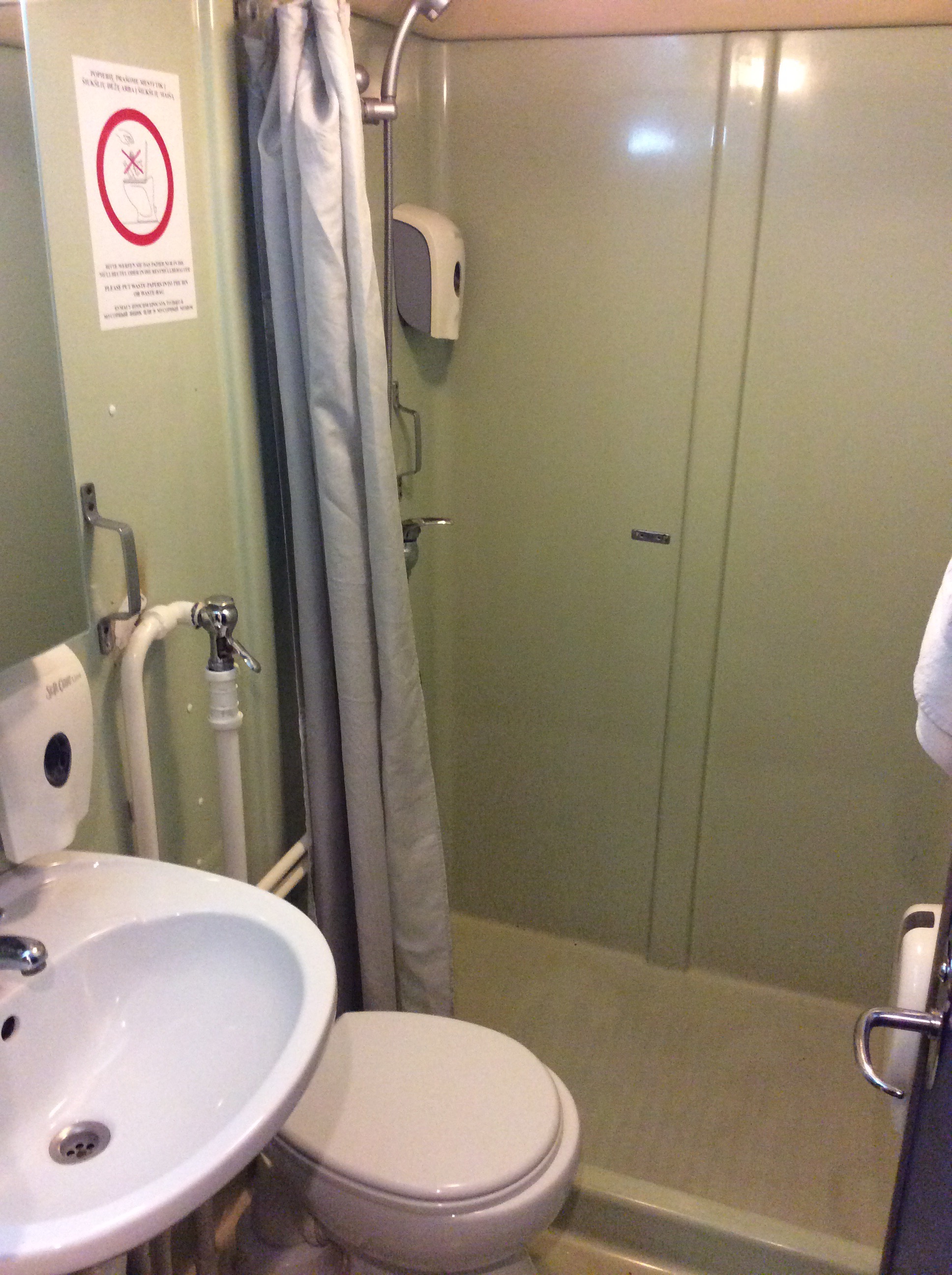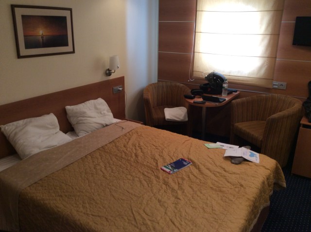 Ich wurde in Georgien äußerst zuvorkommend behandelt, ich musste im Gegensatz zu allen Anderen nichts auspacken und ich war in 3 Minuten durch die Passkontrolle. Der Haken war nur, erst wenn alle durch waren, durften wir aufs Schiff. Gegen 23:00 Uhr war es dann soweit, ich durfte mit der Gummikuh aufs Schiff, die Vertauung übernahm ein netter Matrose und ich schleppte meine Sachen über steile Aufgänge bis zur Rezeption. Von dort war es dann nicht mehr weit zu meiner A1 Kabine.
