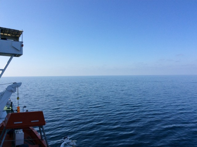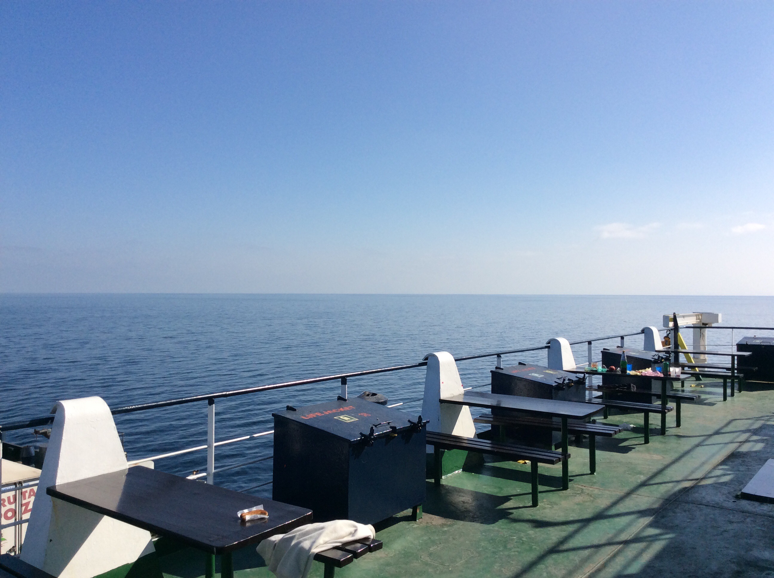 Nach dem Essen gehe ich kurz an Deck. Der Himmel ist wolkenlos, es weht kein Wind und die See ist spiegelglatt. So gleitet unsere Fähre stetig Richtung Norden.