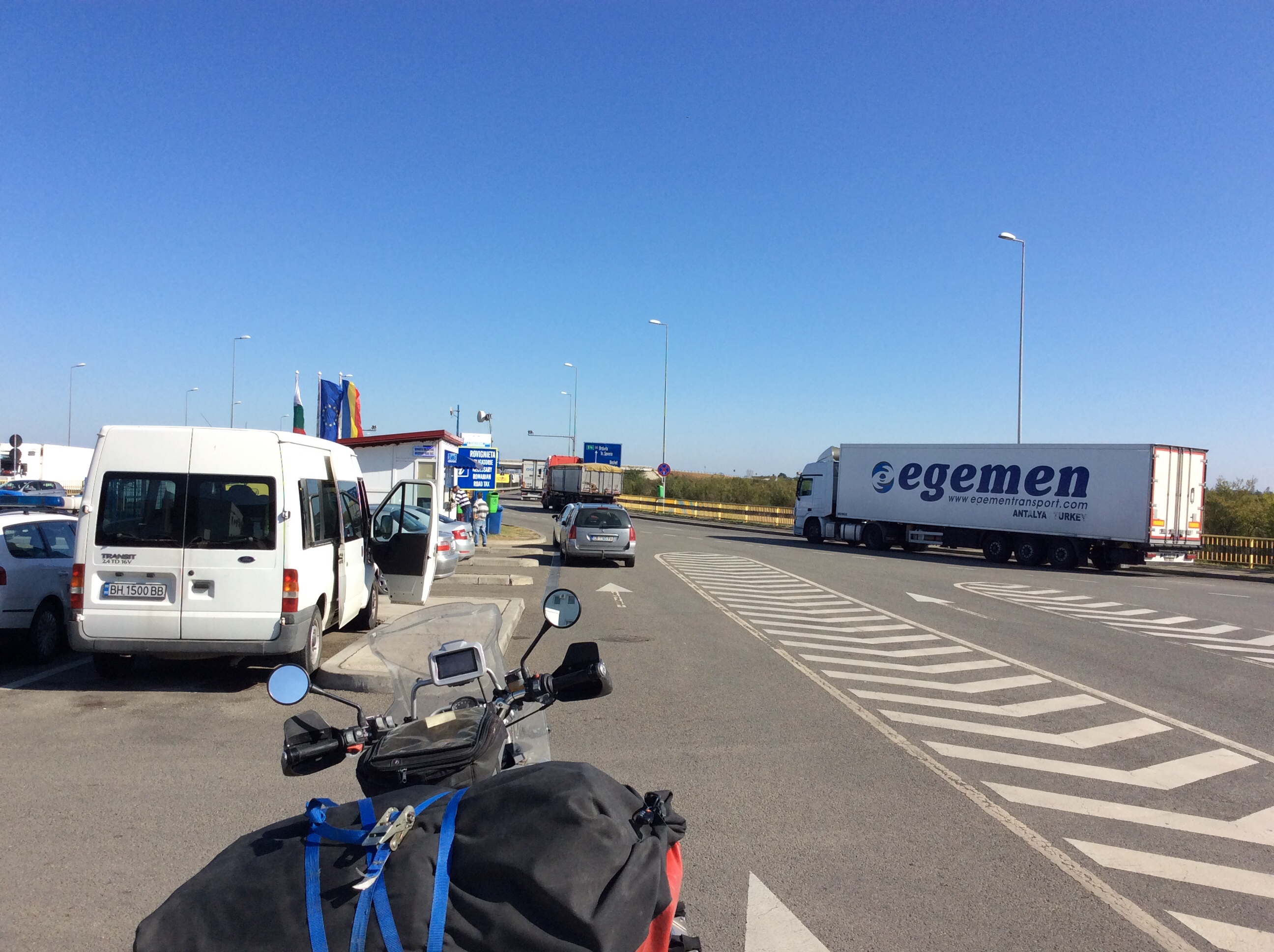 Da ich gut in der Zeit liege, genehmige ich mir ein ordentliches Frühstück und starte gegen 7:45. Bis zur Grenze geht es auf einer gut ausgebauten Autobahn zügig voran. Ich tanke nochmals und dann kommt Sie. Sagt man uns nicht immer, es gäbe in der EU keine Grenzen bzw. Grenzkontrollen mehr? Wenn dem so ist, dann gehören Bulgarien 🇧🇬 und Rumänien 🇷🇴 nicht zur EU. Alleine die LKW Schlage auf der bulgarischen Seite ist 3km lang! Für die PKW sind 4 Schalter geöffnet und ich stehe ca. 45 Minuten an. Das Prozedere selber ist innerhalb von 2 Minuten erledigt. Ich darf passieren. Auch die Rumänen kontrollieren und hier dauert es nochmals 30 Minuten beim Anstehen und 3 Minuten bei der eigentlichen Kontrolle.