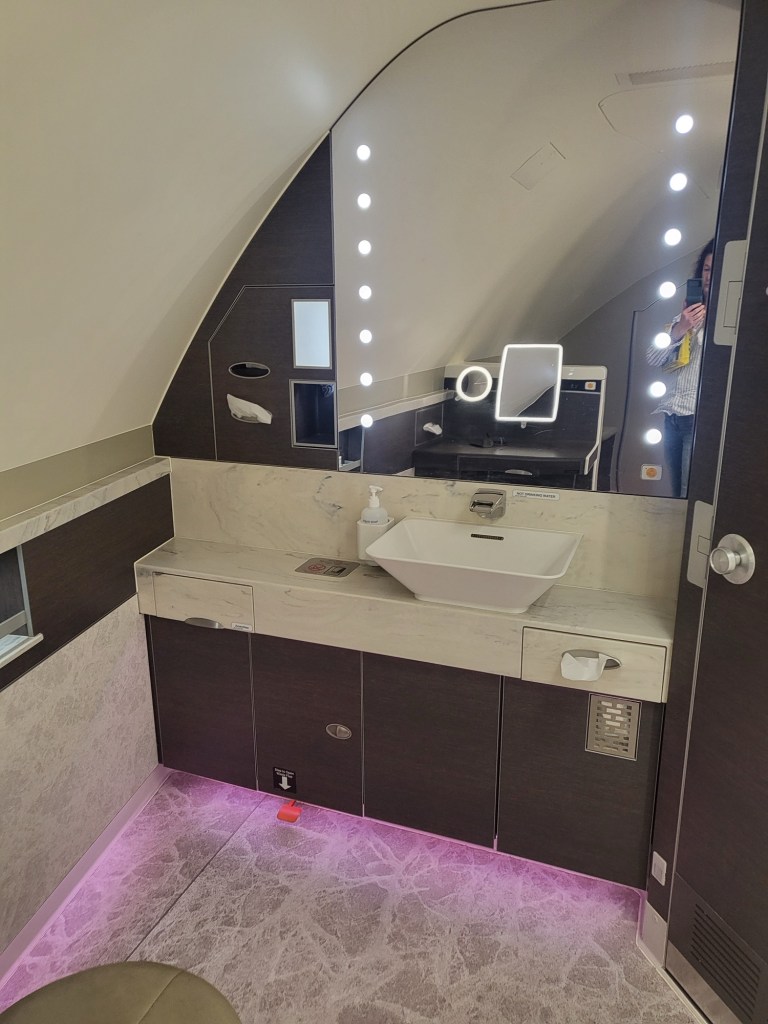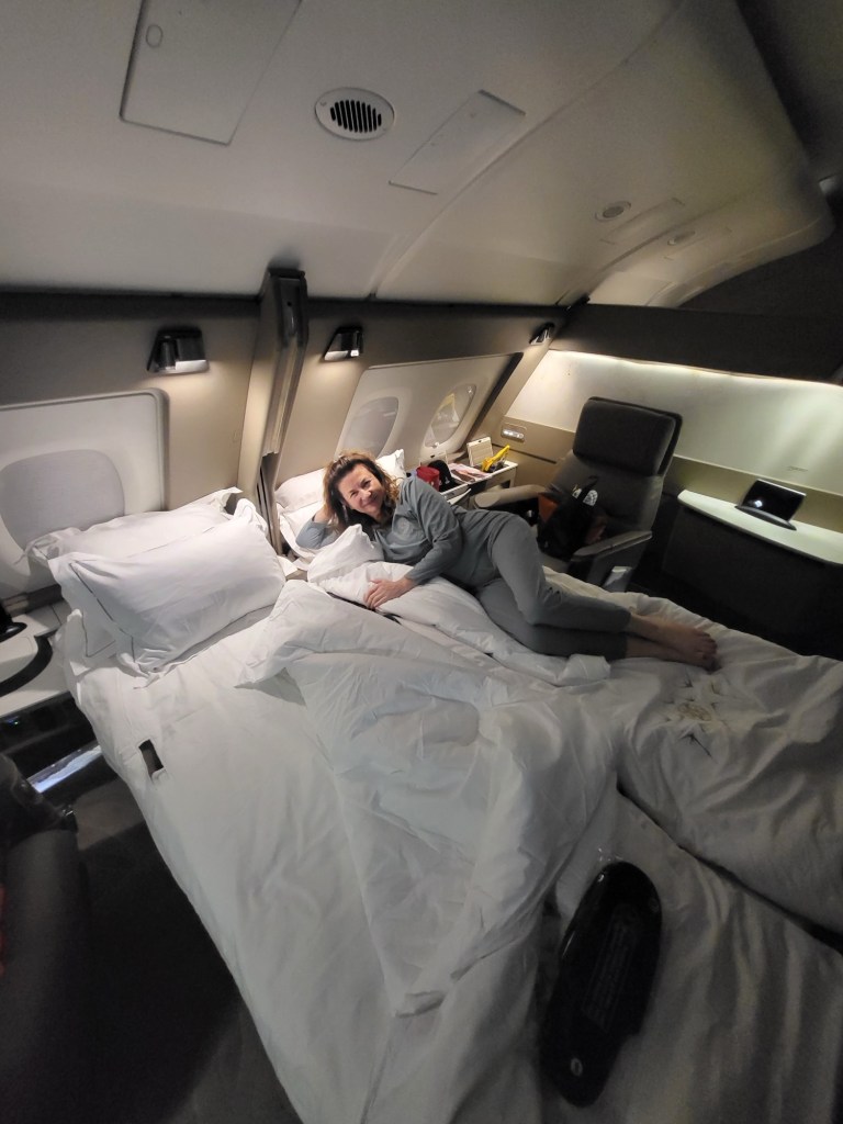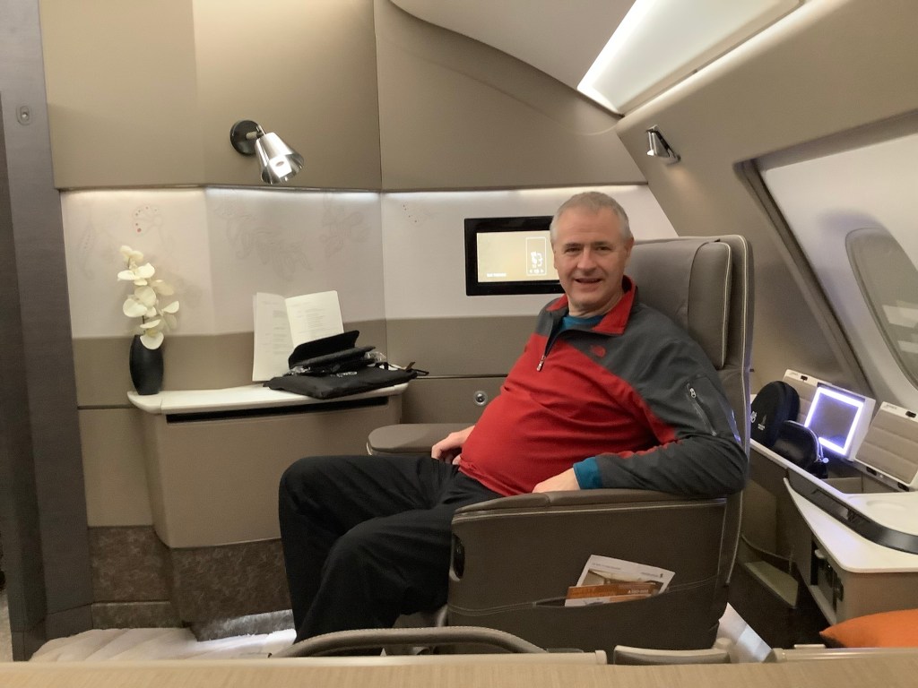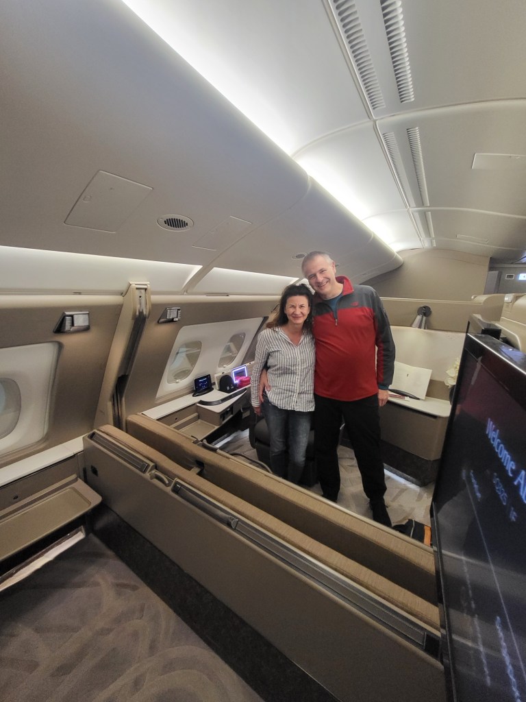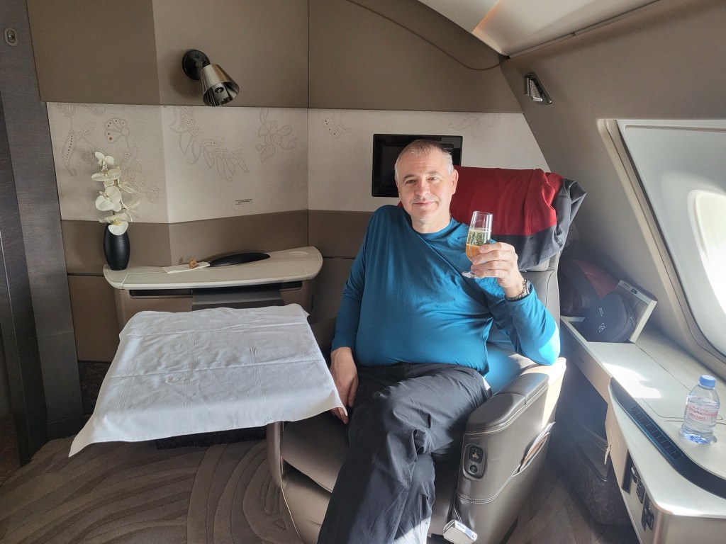So konnte sich Dani nun in Ruhe umziehen und frisch machen und ich mir noch zwei leckere Spritz an der Bar gönnen. Danach ging es zum Gate und über den oberen Zubringer direkt ins Oberdeck des A380. Wir wurden freundlich in Empfang genommen und ab jetzt fühlten sich Krethi & Plethi doch etwas überfordert.