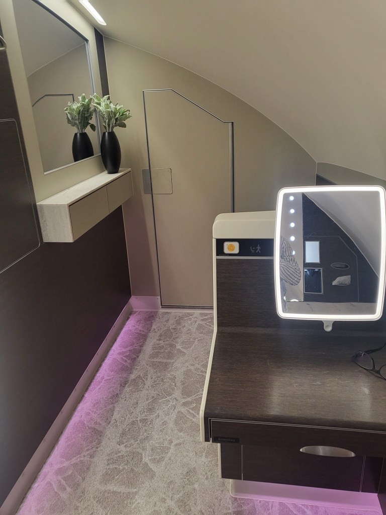 Die First Class füllt das gesamte Oberdeck aus und ist reserviert für sage und schreibe 6 Personen. Diese werden von 3 Flugbegleitern ab dem Betreten rund um die Uhr für 12 Stunden umsorgt.