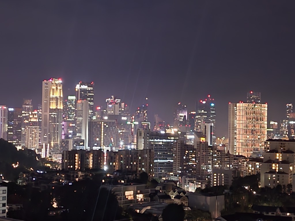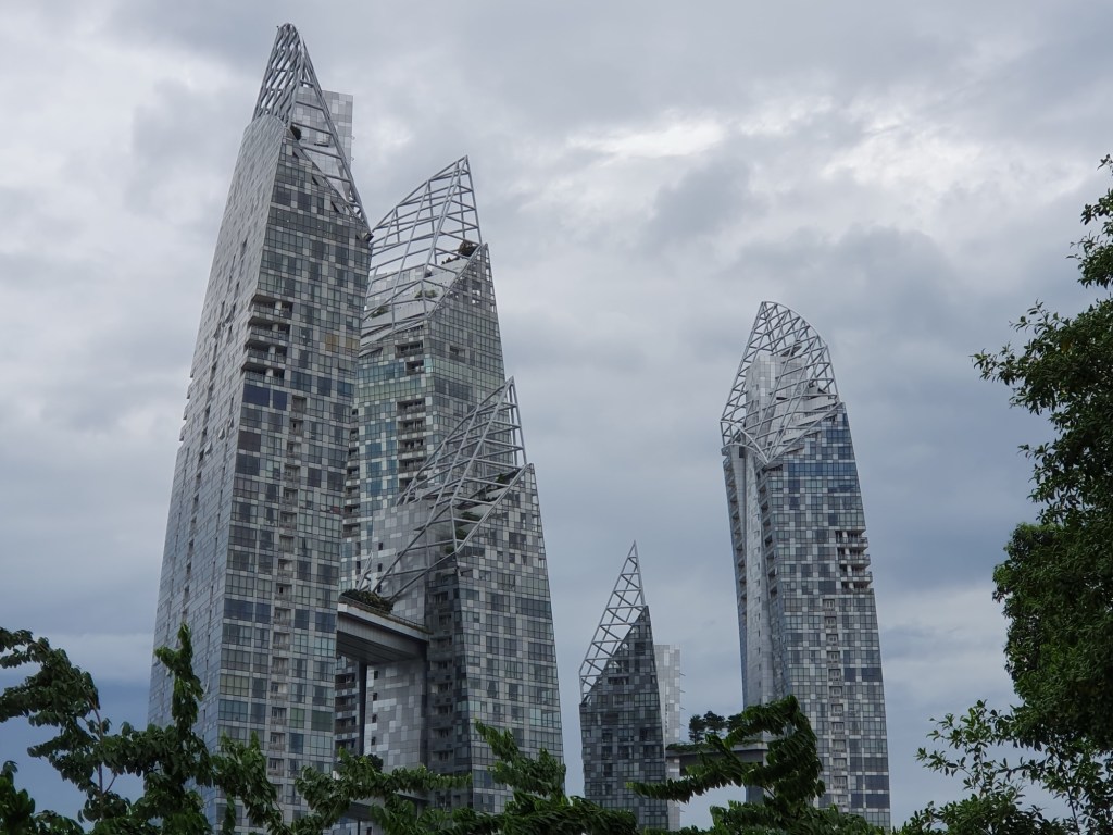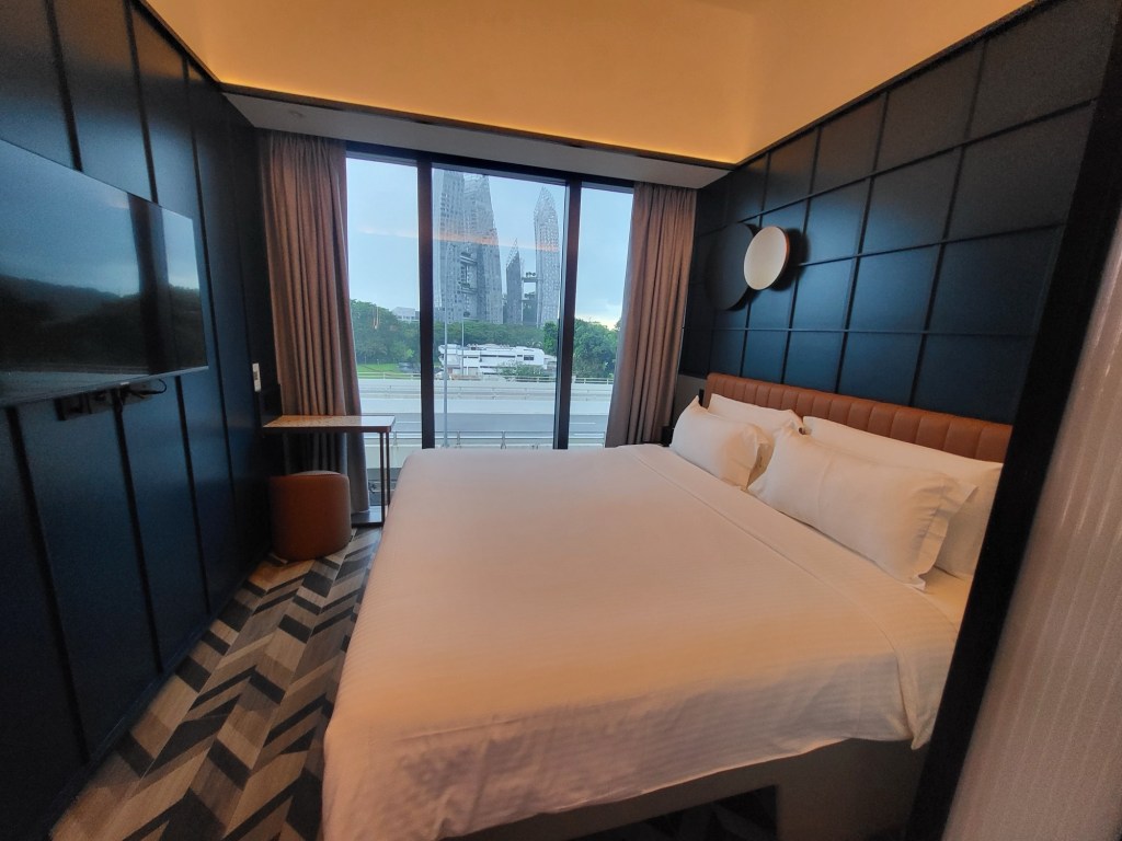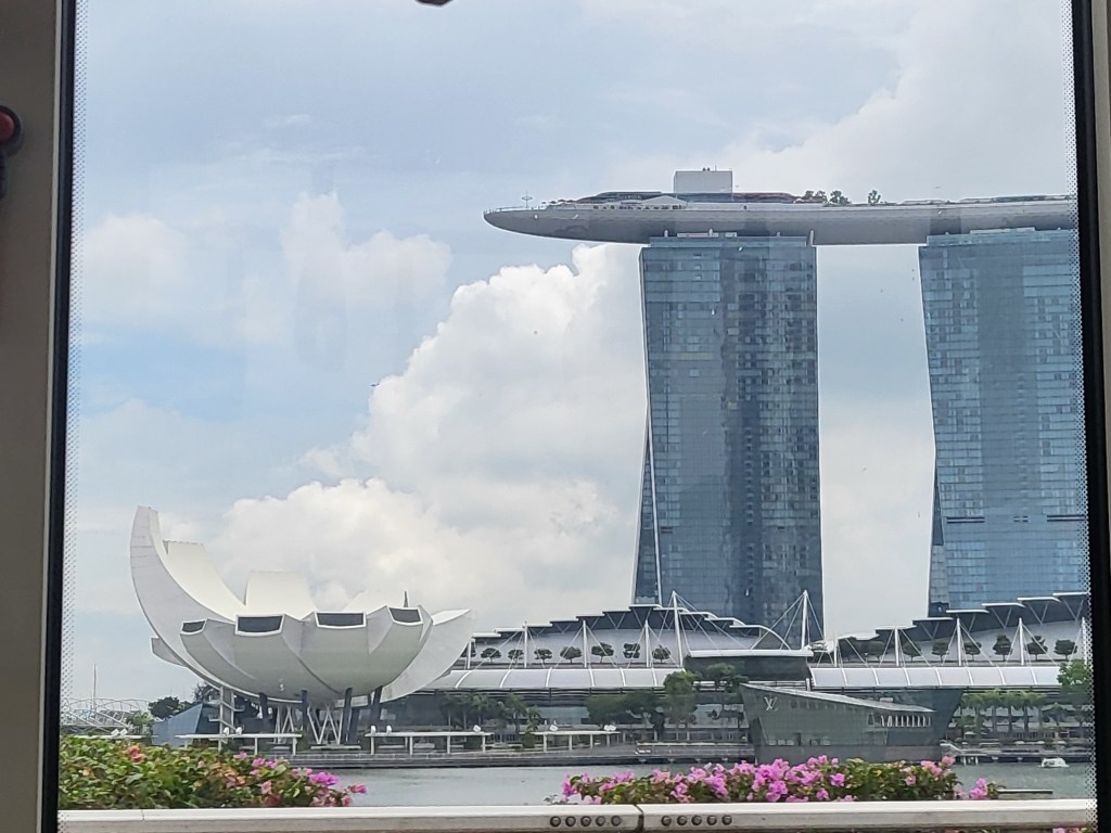 liegt verkehrsgünstig an der Circle Line, ist hipp eingerichtet, verfügt über einen schönen Dachpool, bietet ein recht gutes Frühstück, das Bett ist prima und Dusche und WC sind top. Wo liegt der Haken? Nun das Zimmer ist recht klein und es bedurfte schon etwas Zeit, bis wir unsere Sachen untergebracht hatten. Dafür wurden wir mit einem futuristischen Ausblick belohnt.