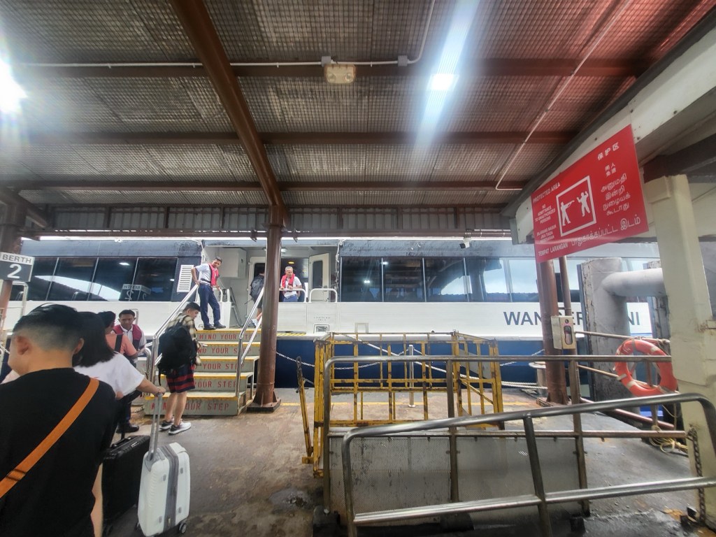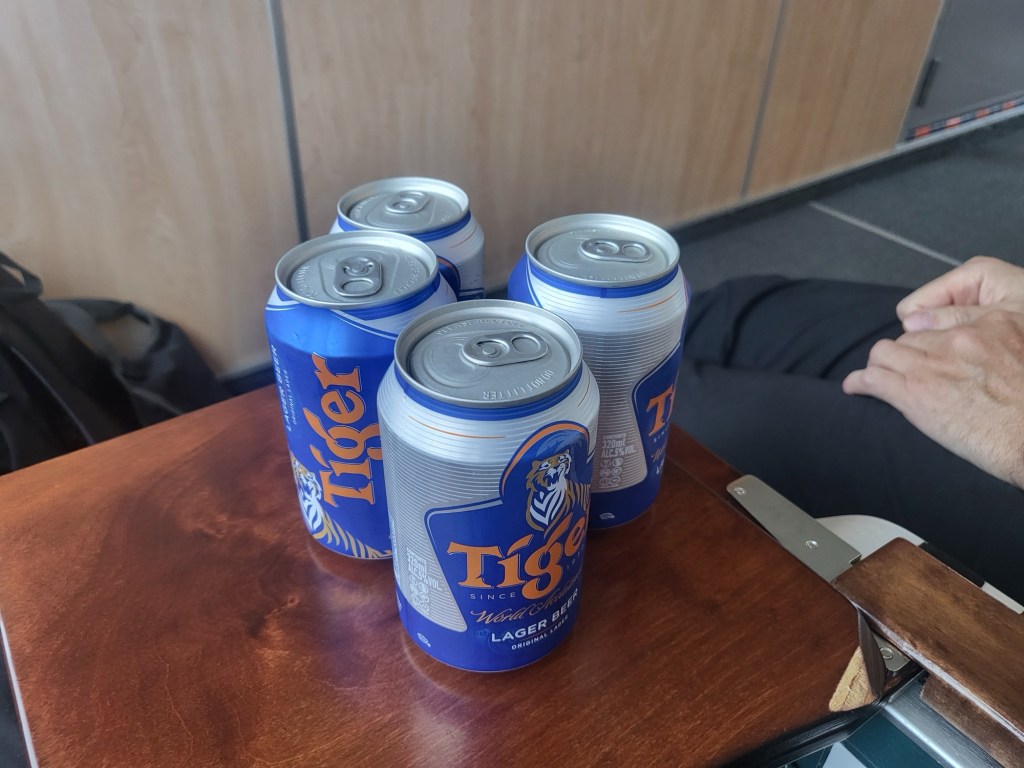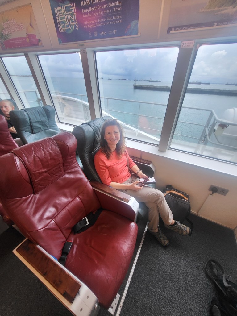 Es klappte alles wie beschrieben. Dank des gebuchten Emerald Service, so nennt die Fährgesellschaft ihre Business Klasse, klappte das Einchecken wie am Schnürchen. Am TMFT Schalter waren wir die ersten und nach kurzer Wartezeit konnten wir bereits beim Gepäckschalter unsere kleinen Koffer abgeben. Die Ausreise verlief unspektakulär und nach insgesamt 10 Minuten waren wir bereits ausgereist und saßen entspannt in der Emerald Lounge bei einem Saft nebst Keksen. Ca. 10 Minuten vor unserer Abfahrt traf dann die Fähre aus Bintan kommend ein und pünktlich gegen 14:00 Uhr, begann das Einchecken. Da wir insgesamt recht wenige Fahrgäste waren, legten wir dann gegen 14:15 ab. Ich hatte bei unserer Emerald Buchung auch eine HappyHour Option gewählt und so erlebten wir die ruhige überfahrt mit jeweils 2 Büchsen Tiger Bier recht entspannt und kurzweilig.
