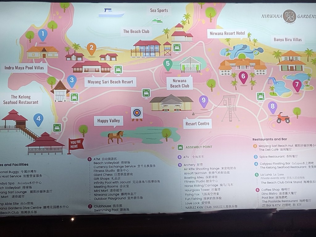 Das Gelände ist riesig, derzeit fast touristenleer und gliedert sich in verschiedene Übernachtungsklassen. Wir haben für unsere Zeit zwischen dem 18.-24. Nov. eine mittlere Preisklasse inkl. Frühstück gewählt. Dies ist empfehlenswert für all diejenigen, die diesem goldenen Käfig zumindest zeitweise entfliehen wollen. Das Resort richtet sich vor allen Dingen an Touris aus Singapur. Es ist eine heile Welt, ohne Stress, mit überaus freundlichen Angestellten, top organisiert und sauber. So wie es der gestreßte Gast aus Singapur halt erwartet. Das ganze hat natürlich seinen Preis. Ein Abendessen (reichlich und lecker) ist ohne Alkohol, nicht unter 90€ (für zwei) zu bekommen. Deshalb waren wir froh, dass ich bereits zeitig einen Vermieter für Roller auf dieser Insel ausfindig gemacht hatten. So erhielten wir dann am 19. morgens bereits unseren Scooter und damit die Möglichkeit, mehr als nur diese heile Welt zu erkunden.