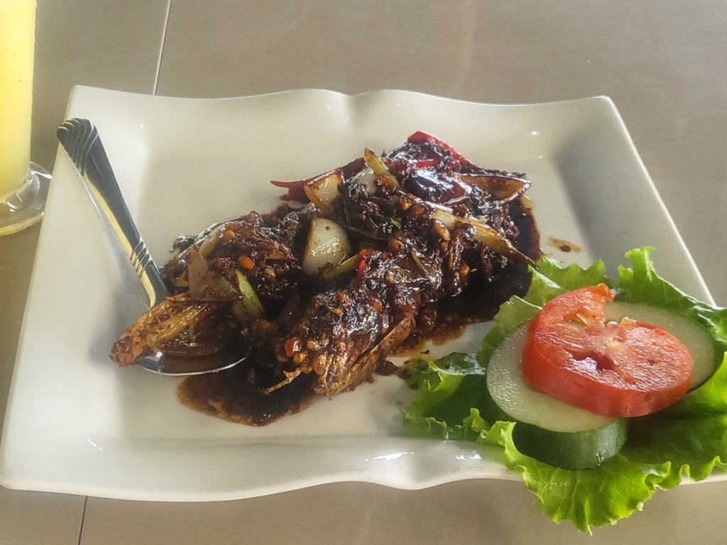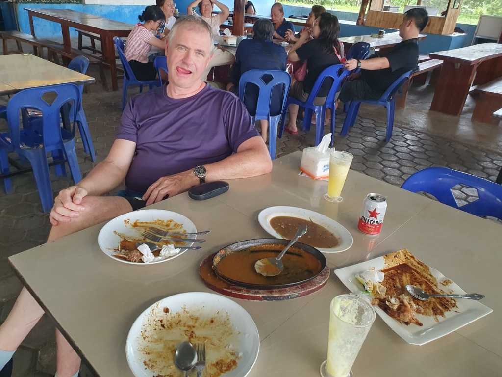 Die Fahrt aus dem Resort dauert gefühlt ewig. Unser kleiner Roller trägt uns bis zum 2. Kontrollgate, das sind exakt 14,5 Kilometer. Danach beginnt eine andere Welt. Die Straßen werden belebter, am Rand liegt auch mal etwas Müll und die Häuser und Verkaufsstände am Straßenrand entsprechen mehr dem Standard der 2.-3. Welt. Was aber bleibt, ist die Freundlichkeit, die uns allenthalben entgegenschlägt. So erkunden wir mit unserem Scooter die Insel, werden bei den regelmäßig vorkommenden Regenschauern mal weniger, viel öfter aber mehr als nur ein wenig nass. Bereits am 19. haben wir in der Nähe des 2. Kontrollgates unsere Lieblings Esshalle gefunden. Hier bieten, in einer großen „Scheune“, verschiedene Familien Ihre Speisen an und für insgesamt 6-12€ ist die Qualität nicht schlechter als im Hotel und sehr lecker! Ich behaupte sogar, es ist wesentlich frischer. Somit hat sich unsere Scooter Leihgebühr (5T, 135SGD) bereits nach 2 Tagen mehr als amortisiert. Übrigens, eine Tankfüllung, das ist dann eine 1,5 Liter PET Flasche, kostet hier 20000 Rupien, das sind 1,20€ und das reicht für einen ganzen Tag.