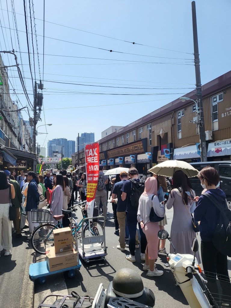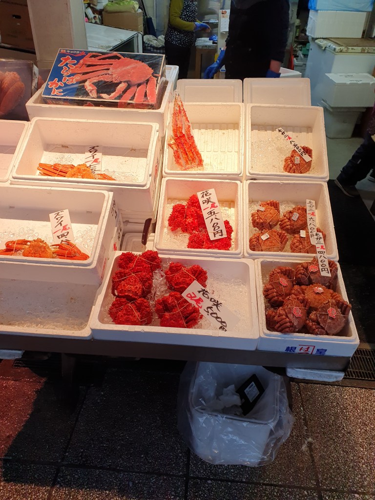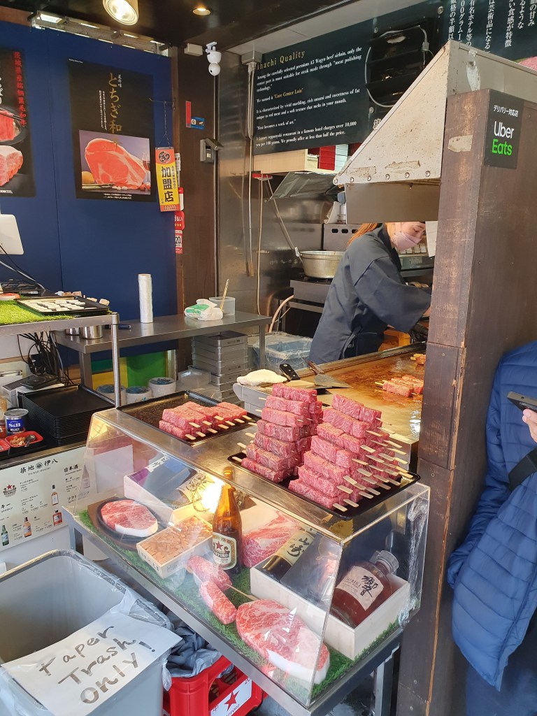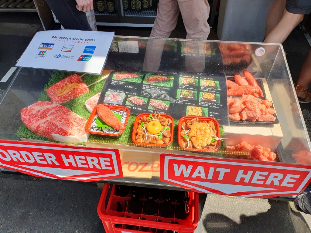 An diesem Tag haben wir den Fischmarkt in Tsukiji besucht. Wir finden, dies ist ein Highlight in Tokyo. Wer lecker Fisch und sonstiges Meeresgetier vertilgen will, für den ist dieser Fleck Erde ein wahres Mekka. Der Fischmarkt besteht hierbei aus zumindest zwei verschiedenen Abteilungen. Da sind zuerst einmal dutzende von Geschäfte, Lokale und Markstände, die sich in verschieden Gassen vor den eigentlichen Markthallen angesiedelt haben. Hier bekommt man bereits von Fleisch bis Fisch so manche Leckerei. Hinzu kommen dann noch die diversen Messer- und Souvenirshops. Unser Tipp hierzu lautet, zuerst einmal links liegen lassen und erstmal die Markthallen aufsuchen. Dort bekommt man an den verschiedenen Ständen fangfrischen Thunfisch, Austern oder sonstiges Getier. Am Beispiel vom Thun ein kleiner Leitfaden. Ganz am Ende, sind mehrere Händler, dort werden Thunstücke (ca. 200-300 Gramm) in verschiedenen Qualitäten (siehe Preise) angeboten. Hier ein Stück auswählen und dem Händler anzeigen, dass dies geschnitten (Cutt) werden soll. Alles weitere geschieht dann automatisch. Nun mit der Beute auf die 3.Etage dieses Gebäudes, sich dort einen Platz suchen und genießen. Einen besseren Thunfisch (wenn er etwas teurer war) bekommt man nirgendwo auf der Welt.