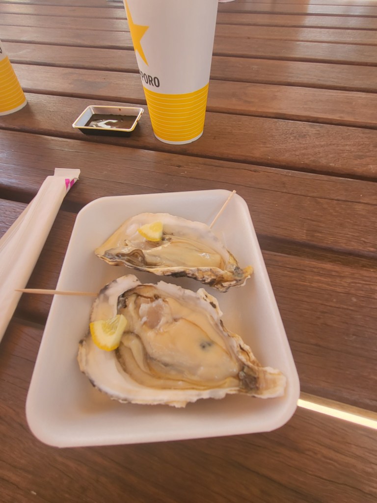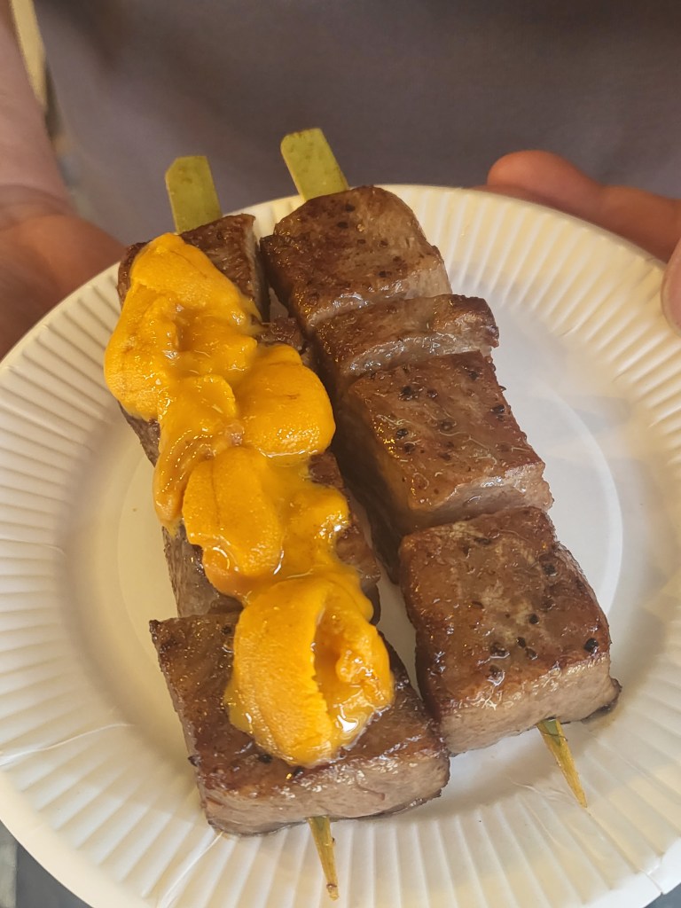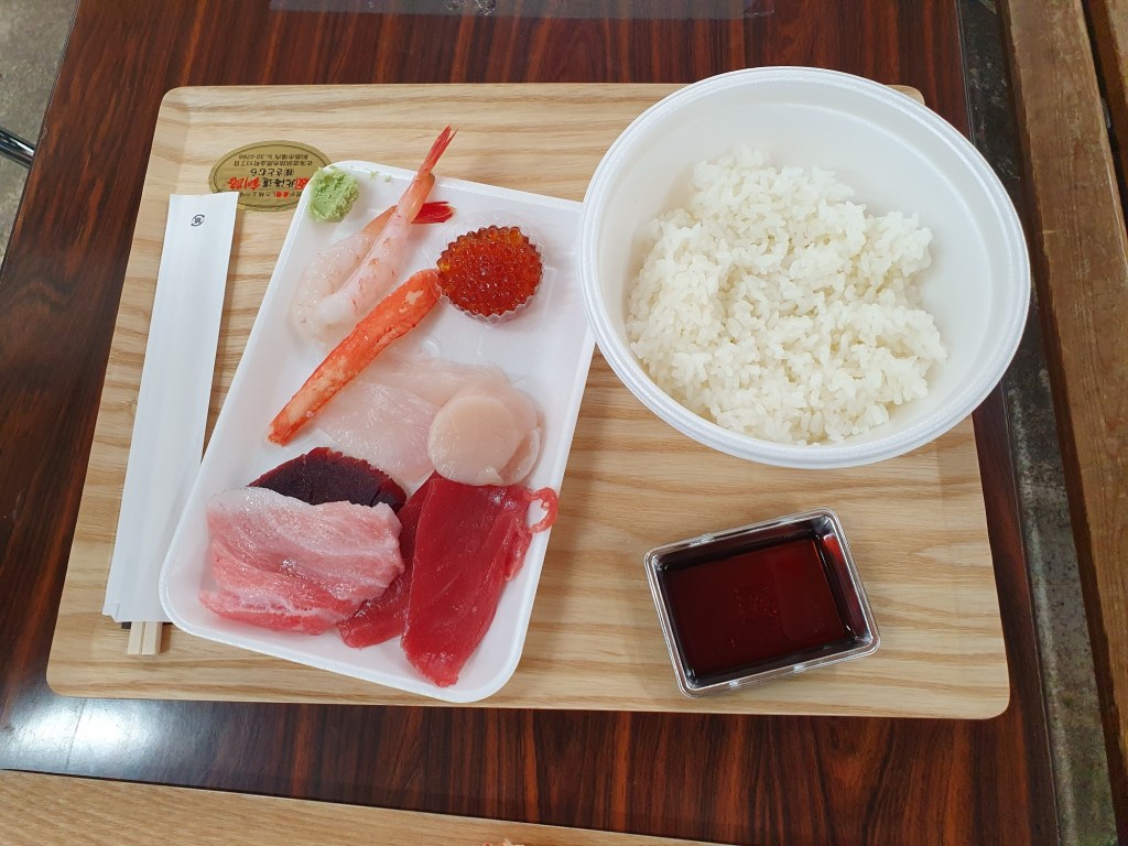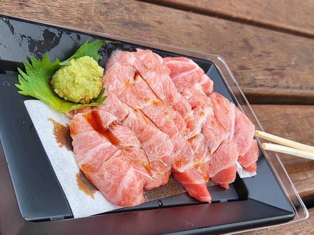 An diesem Tag haben wir den Fischmarkt in Tsukiji besucht. Wir finden, dies ist ein Highlight in Tokyo. Wer lecker Fisch und sonstiges Meeresgetier vertilgen will, für den ist dieser Fleck Erde ein wahres Mekka. Der Fischmarkt besteht hierbei aus zumindest zwei verschiedenen Abteilungen. Da sind zuerst einmal dutzende von Geschäfte, Lokale und Markstände, die sich in verschieden Gassen vor den eigentlichen Markthallen angesiedelt haben. Hier bekommt man bereits von Fleisch bis Fisch so manche Leckerei. Hinzu kommen dann noch die diversen Messer- und Souvenirshops. Unser Tipp hierzu lautet, zuerst einmal links liegen lassen und erstmal die Markthallen aufsuchen. Dort bekommt man an den verschiedenen Ständen fangfrischen Thunfisch, Austern oder sonstiges Getier. Am Beispiel vom Thun ein kleiner Leitfaden. Ganz am Ende, sind mehrere Händler, dort werden Thunstücke (ca. 200-300 Gramm) in verschiedenen Qualitäten (siehe Preise) angeboten. Hier ein Stück auswählen und dem Händler anzeigen, dass dies geschnitten (Cutt) werden soll. Alles weitere geschieht dann automatisch. Nun mit der Beute auf die 3.Etage dieses Gebäudes, sich dort einen Platz suchen und genießen. Einen besseren Thunfisch (wenn er etwas teurer war) bekommt man nirgendwo auf der Welt.