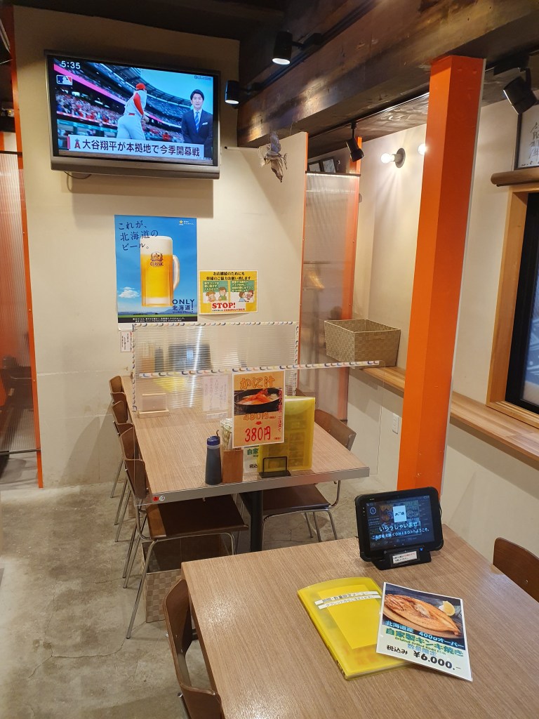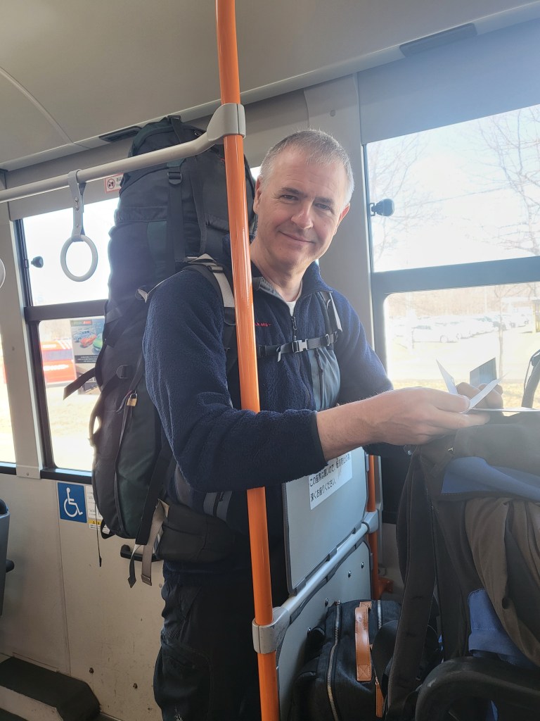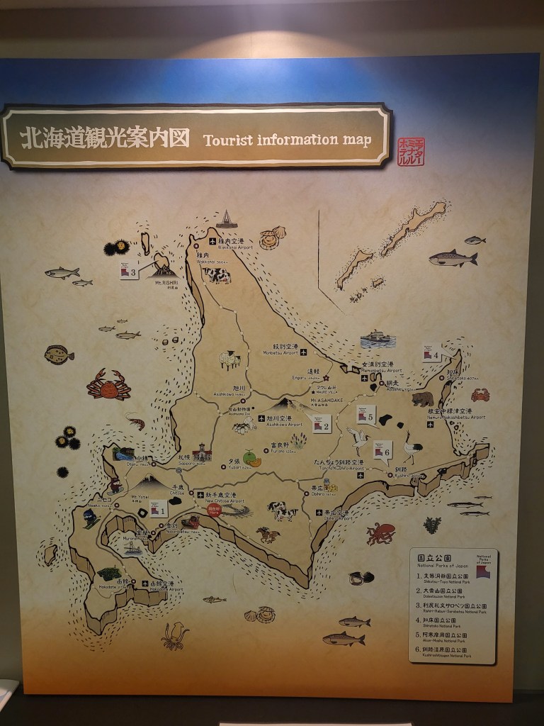Aber Krethi war dann doch nicht ganz clever. Der QRcode muß vor dem Zoll nochmals an einen bereitstehenden Terminal gescannt und bestätigt werden, sonst passiert es, dass der nette Zöllner einen zurück auf Los schickt. So geschah es uns leider und es dauerte 5 Minuten länger, bis wir das Land Nippon betreten durften….Am Flughafen besorgten wir uns dann am bereits bekannten Shop unsere Telefonkarten und machten uns auf zum Terminalwechsel. Ein Shuttle Bus brachte uns zum Inlandsterminal der ANA (All Nippon Airways) und dort angekommen standen wir alsbald am Schalter für den Check Inn nach Sapporo (New Chitose Airport CTS). Ich hatte für insgesamt 150€ bereits in D zwei Tickets erworben und so fragte ich nett, ob nicht ein Upgrade auf Meilen oder Cash möglich sei. Was soll ich sagen, für ein paar Bugs mehr saßen wir später in einer schicken Boing 787 ganz weit vorne und wurden gut bewirtet.