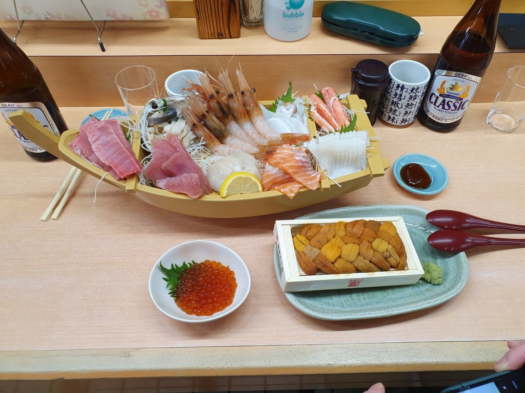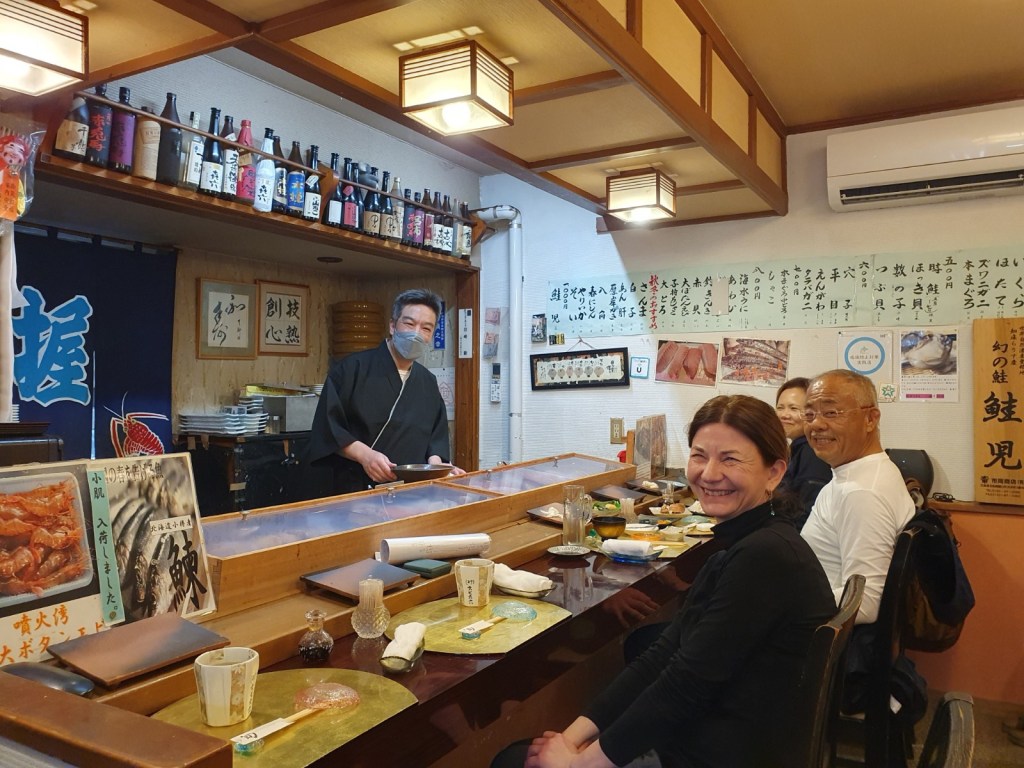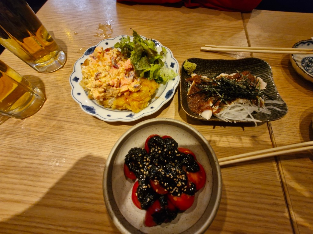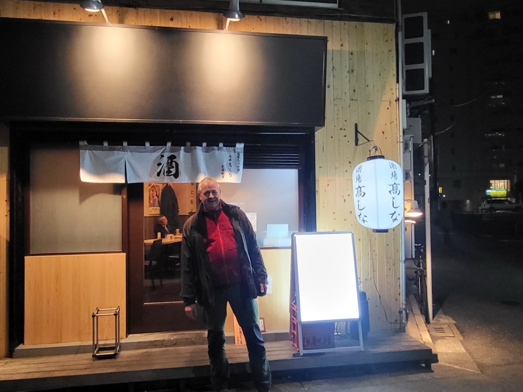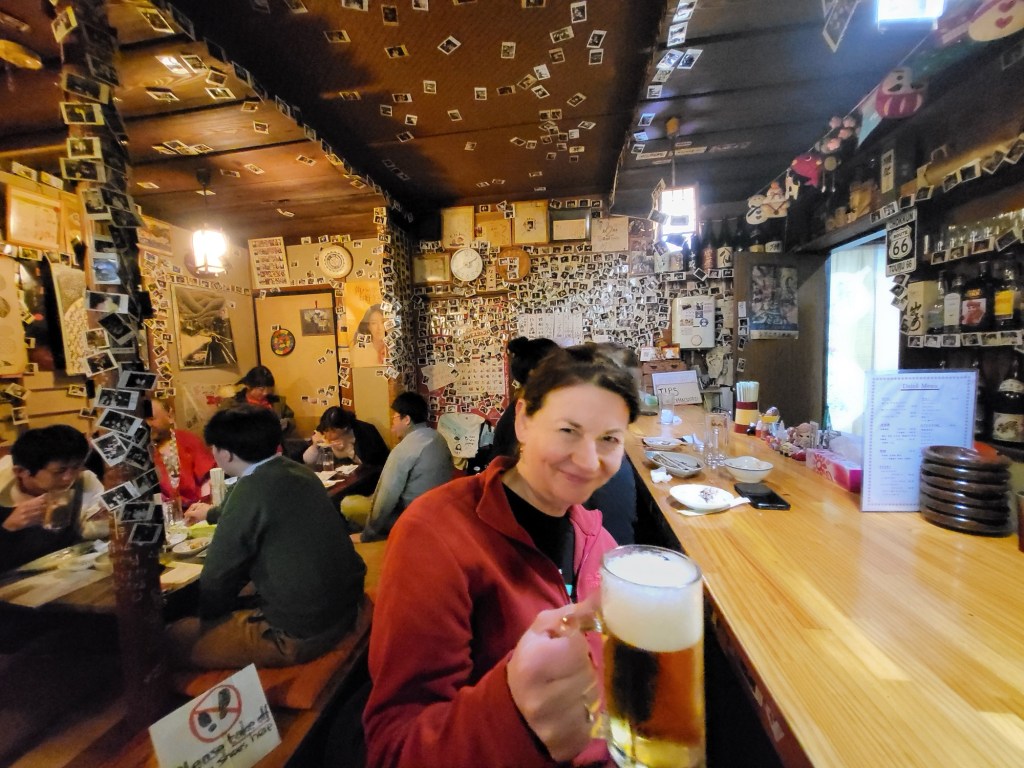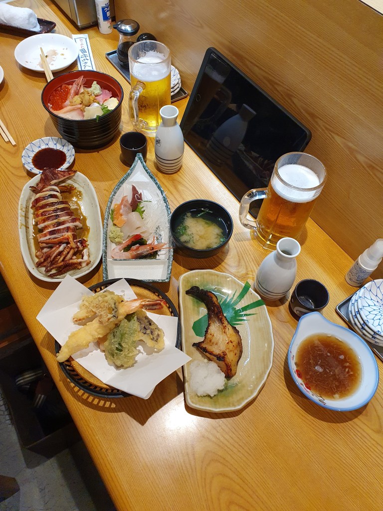 Am Abend suchten wir „unsere“ kleine Izakaya auf. Diese liegt direkt neben dem Almont Inn (siehe Japan 1+2) und nur wenig weiter entfernt von unserem neuen Hotel. Hier speisen überwiegend nur Japaner und es gibt keine englische Speisekarte und der Wirt versteht recht wenig englisch. Somit ist eine Übersetzungs-App (siehe Empfehlung) dringend angeraten. An diesem Tag war das Lokal recht leer und so fanden wir einen gemütlichen Platz. Ich hatte mir vorgenommen, folgenden Satz bei der Bestellung anzubringen: „wir haben Hunger, überraschen Sie uns“. Ich kann sagen, nach jeweils drei Bierchen und vielen Überraschungen, waren wir für insgesamt ca. 7000 Yen positiv überrascht und völlig abgefüllt.