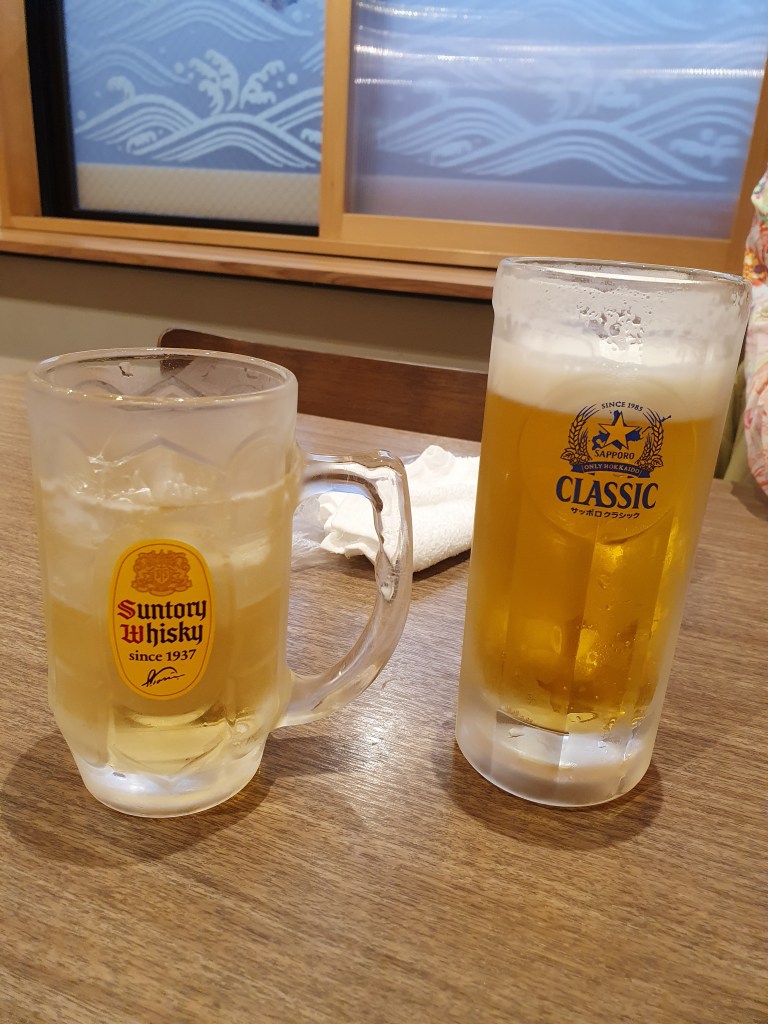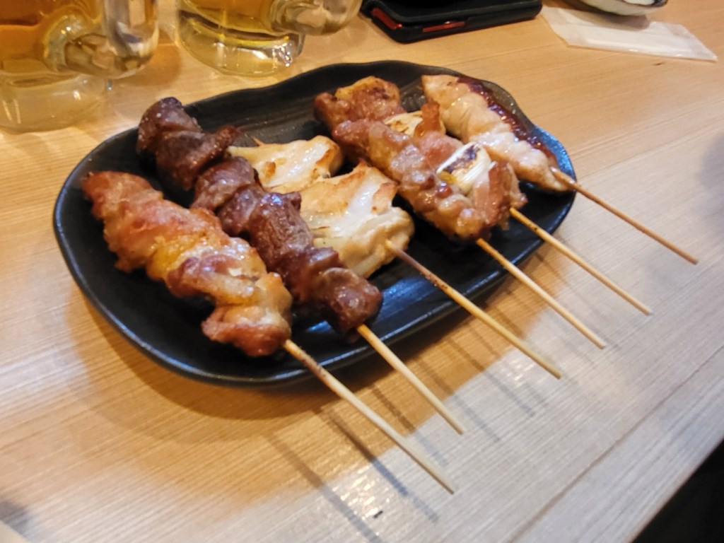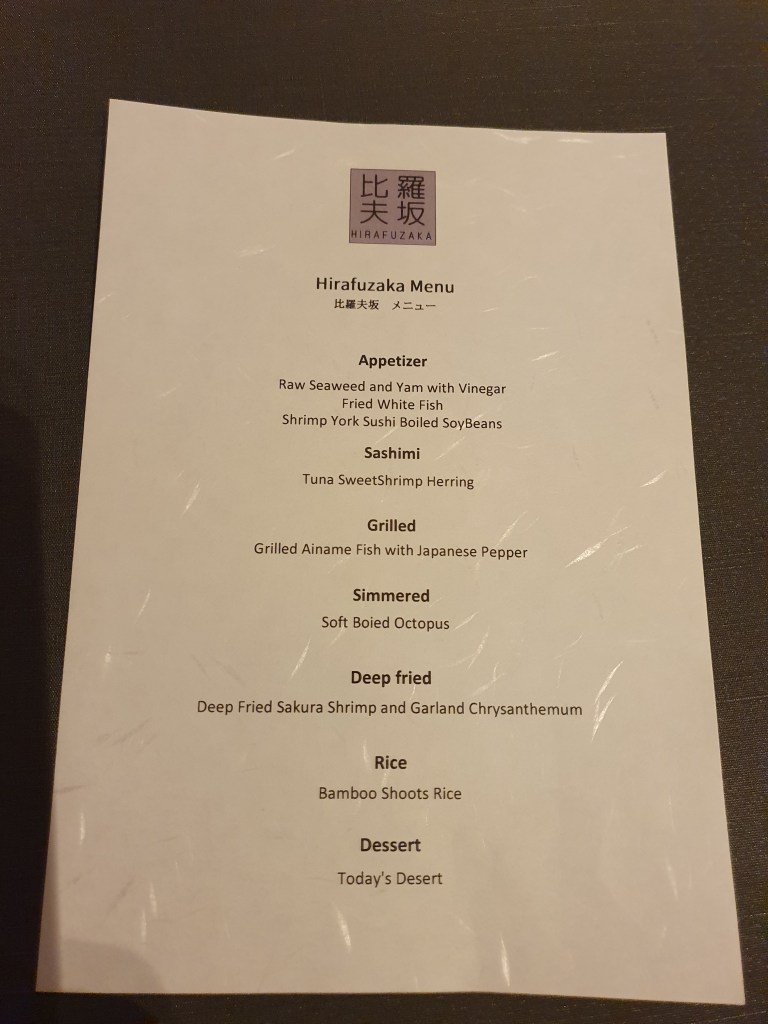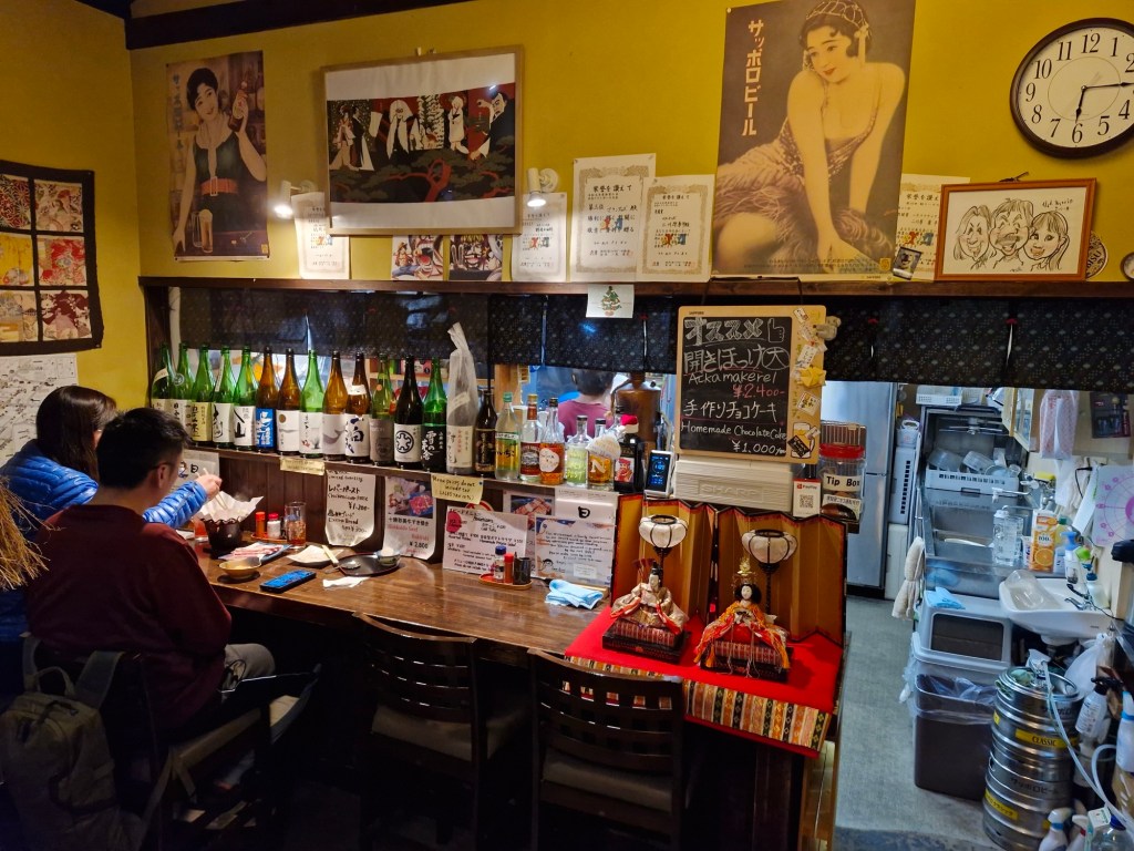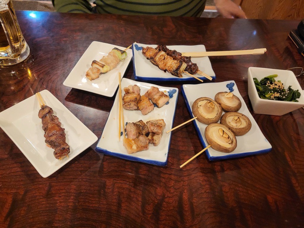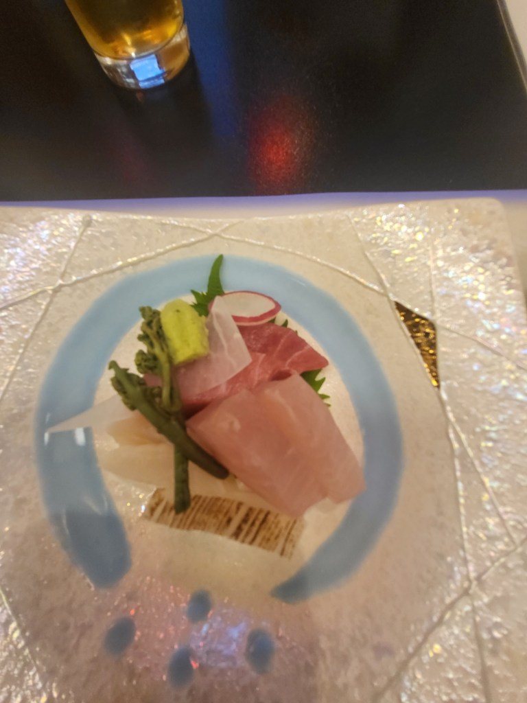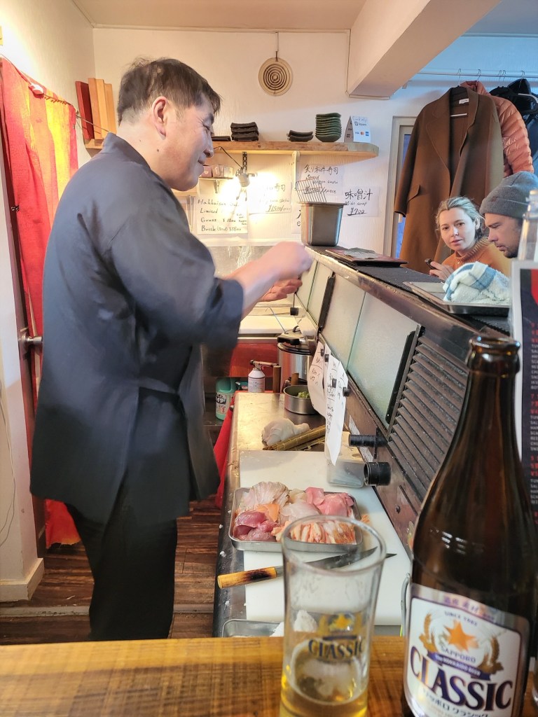 Am Abend suchten wir „unsere“ kleine Izakaya auf. Diese liegt direkt neben dem Almont Inn (siehe Japan 1+2) und nur wenig weiter entfernt von unserem neuen Hotel. Hier speisen überwiegend nur Japaner und es gibt keine englische Speisekarte und der Wirt versteht recht wenig englisch. Somit ist eine Übersetzungs-App (siehe Empfehlung) dringend angeraten. An diesem Tag war das Lokal recht leer und so fanden wir einen gemütlichen Platz. Ich hatte mir vorgenommen, folgenden Satz bei der Bestellung anzubringen: „wir haben Hunger, überraschen Sie uns“. Ich kann sagen, nach jeweils drei Bierchen und vielen Überraschungen, waren wir für insgesamt ca. 7000 Yen positiv überrascht und völlig abgefüllt.