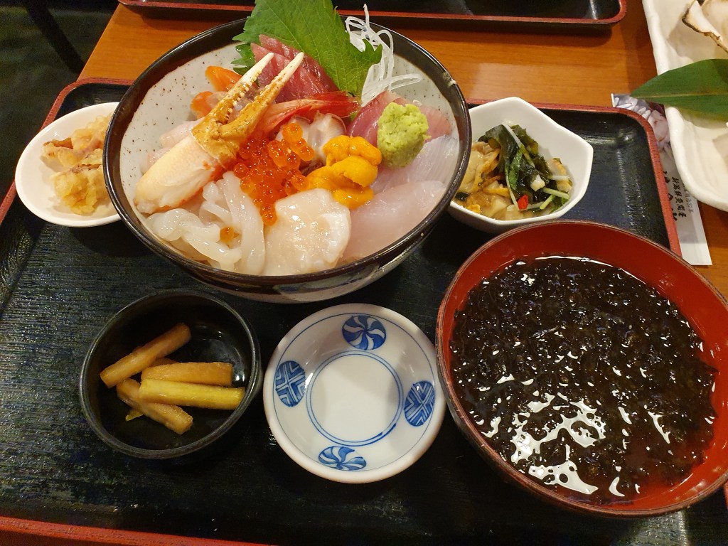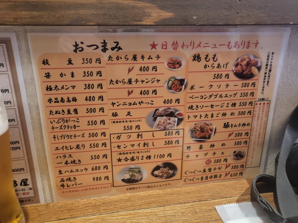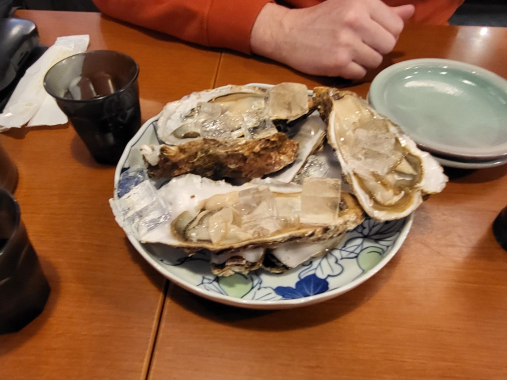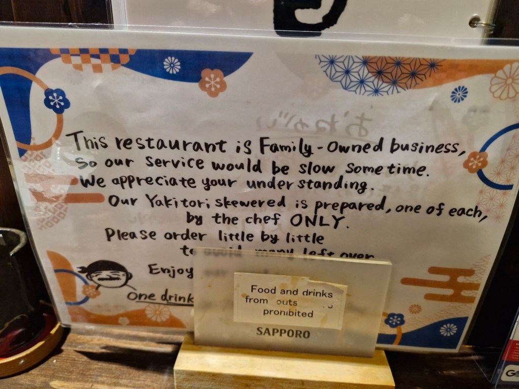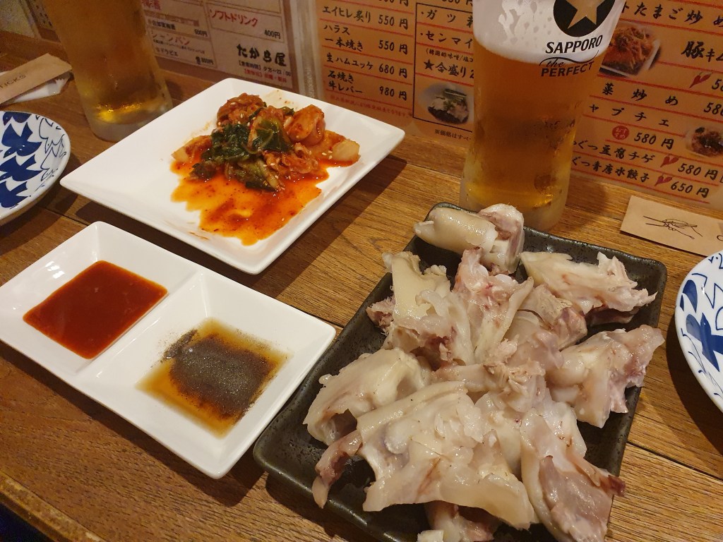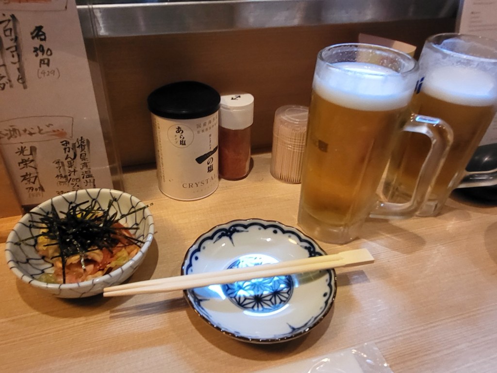 Am Abend suchten wir „unsere“ kleine Izakaya auf. Diese liegt direkt neben dem Almont Inn (siehe Japan 1+2) und nur wenig weiter entfernt von unserem neuen Hotel. Hier speisen überwiegend nur Japaner und es gibt keine englische Speisekarte und der Wirt versteht recht wenig englisch. Somit ist eine Übersetzungs-App (siehe Empfehlung) dringend angeraten. An diesem Tag war das Lokal recht leer und so fanden wir einen gemütlichen Platz. Ich hatte mir vorgenommen, folgenden Satz bei der Bestellung anzubringen: „wir haben Hunger, überraschen Sie uns“. Ich kann sagen, nach jeweils drei Bierchen und vielen Überraschungen, waren wir für insgesamt ca. 7000 Yen positiv überrascht und völlig abgefüllt.