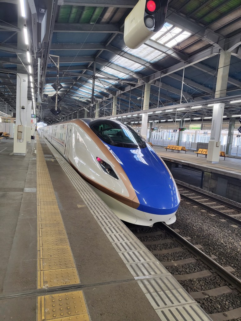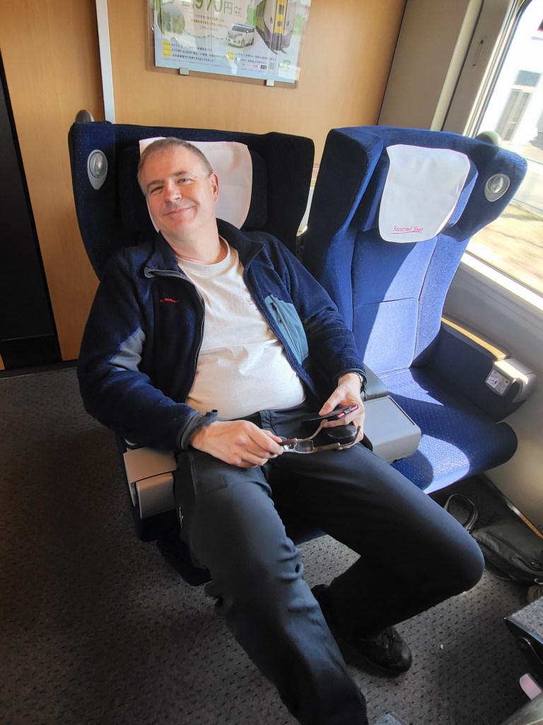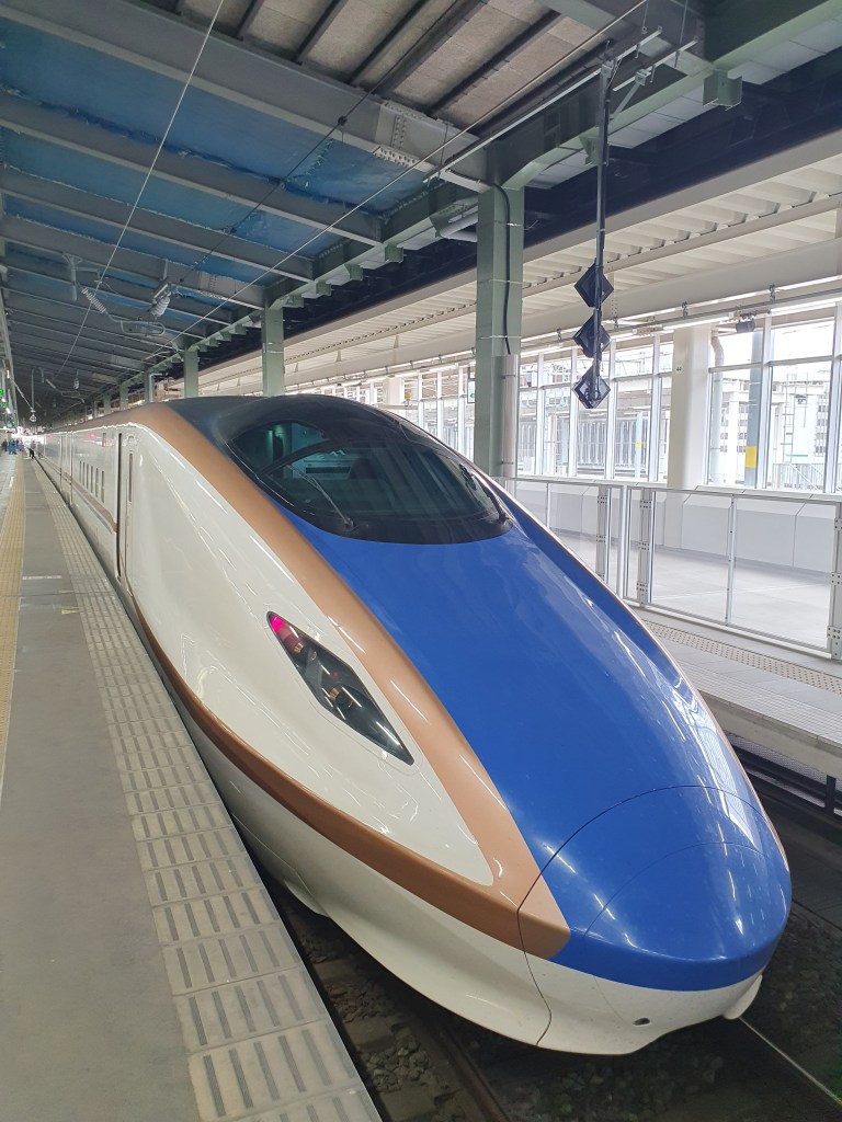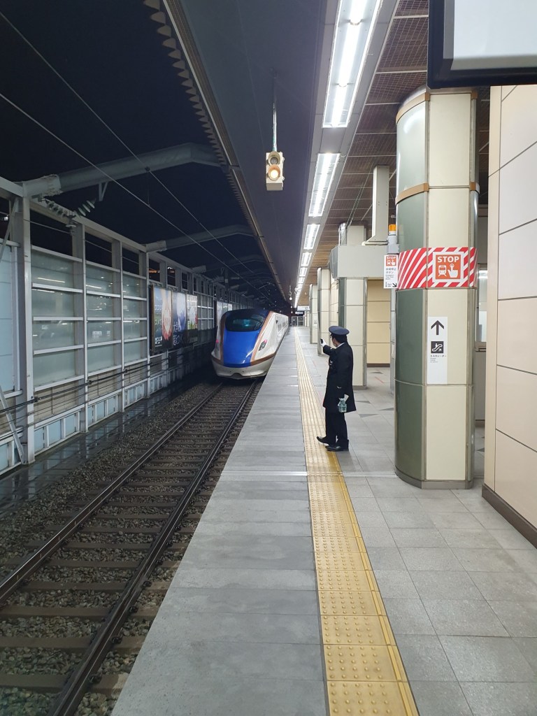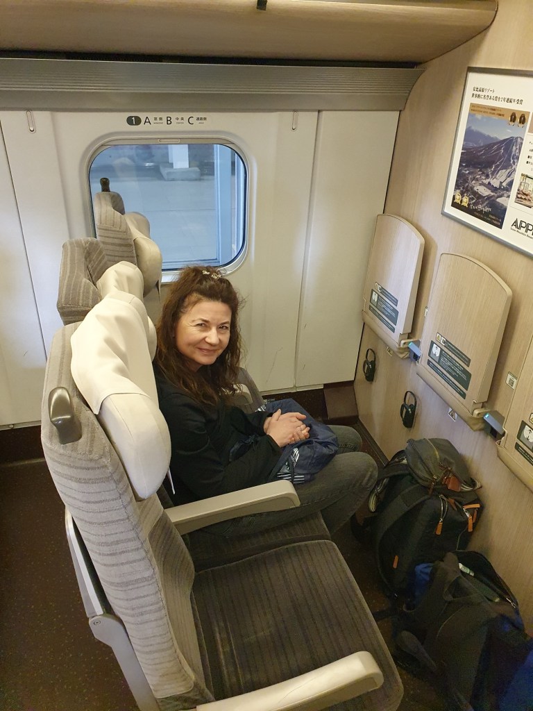 Aber nun zurück zu unserer ersten Shinkansen Fahrt in diesem Urlaub. Wie immer (bisher) war der Zug absolut pünktlich. Wir warten einige Minuten vorher bereits am Bahnsteig an den dafür vorgesehenen Wartepunkten und der Zug hielt dann auch genau dort. So stiegen wir in unser Green Class Abteil (1.Klasse), okkupierten unsere Sitze, verstauten unser Gepäck und genossen ein leckeres Sapporo Bierchen als der Zug Richtung Nagano abbrauste. Japanische Alpen, wir kommen.
