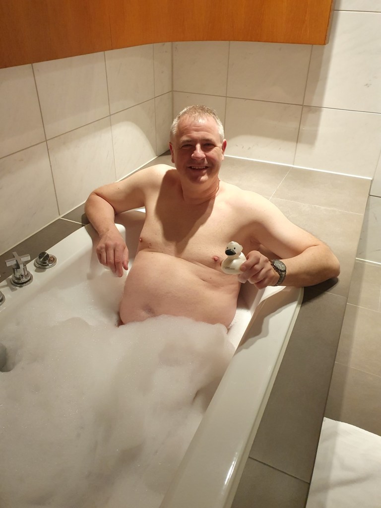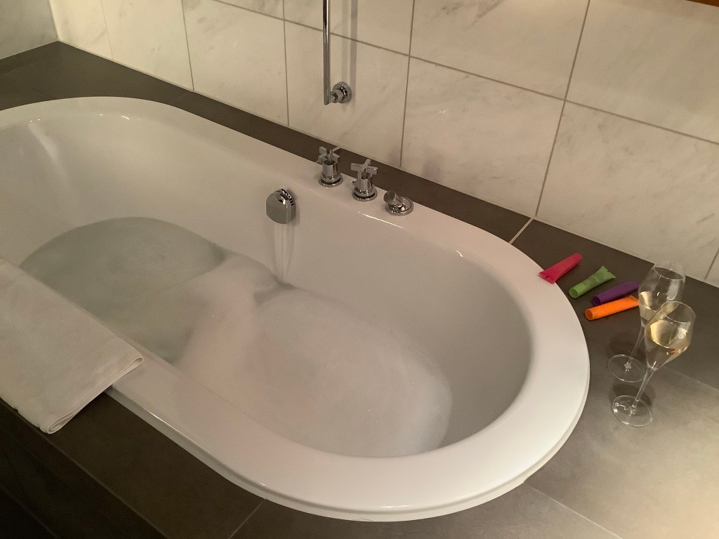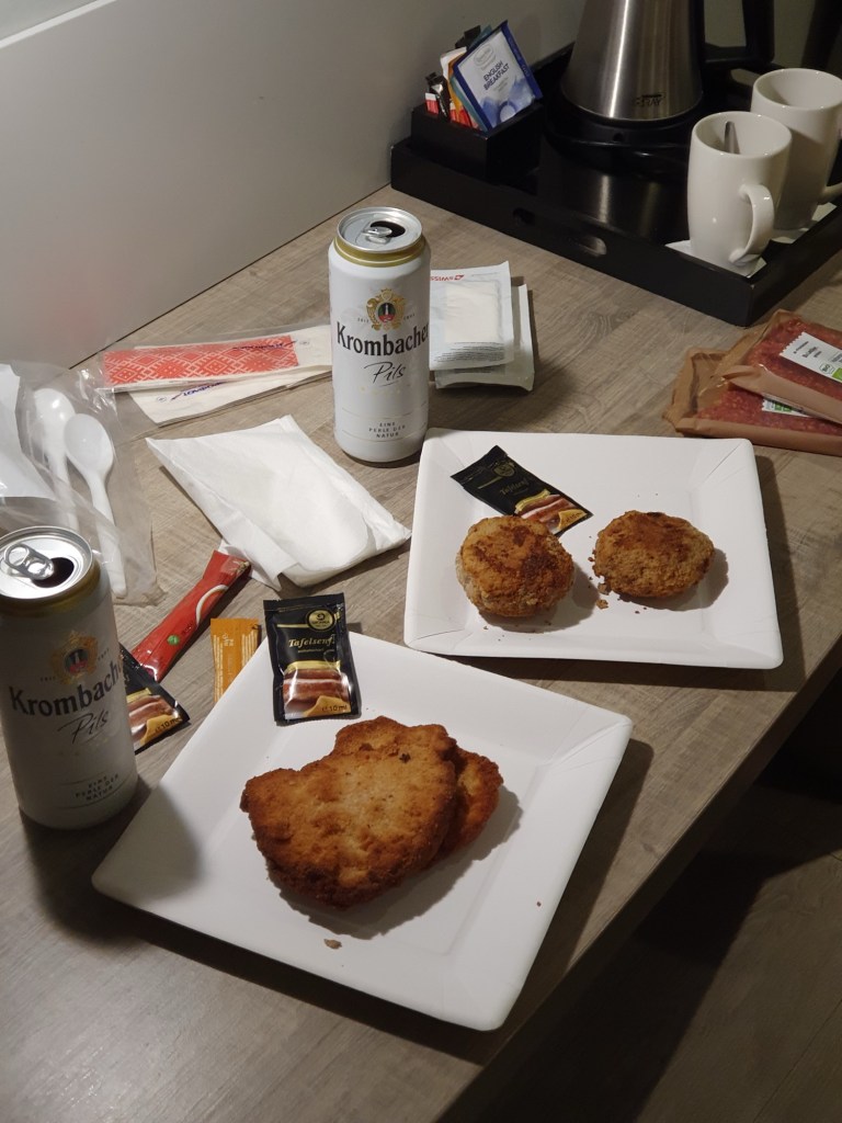 Nach dem Einchecken, machten wir uns dann noch auf zu einem in der Nähe gelegenen Einkaufszentrum und besorgten uns etwas für den Abend und natürlich auch eine Kleinigkeit für die morgige Zugfahrt. Heute Abend wollten wir auf dem Zimmer dinieren und der dicke Krethi den hoteleigenen Hausanzug ausprobieren. Naja!
