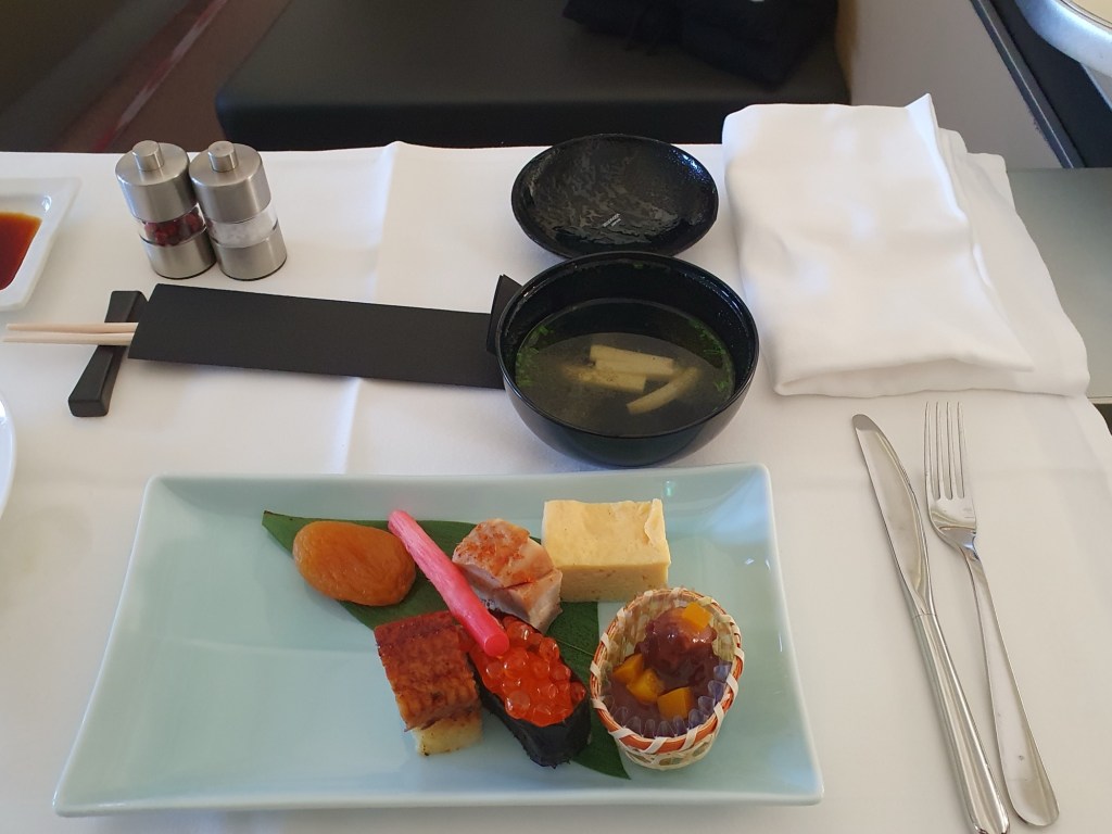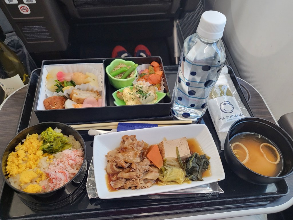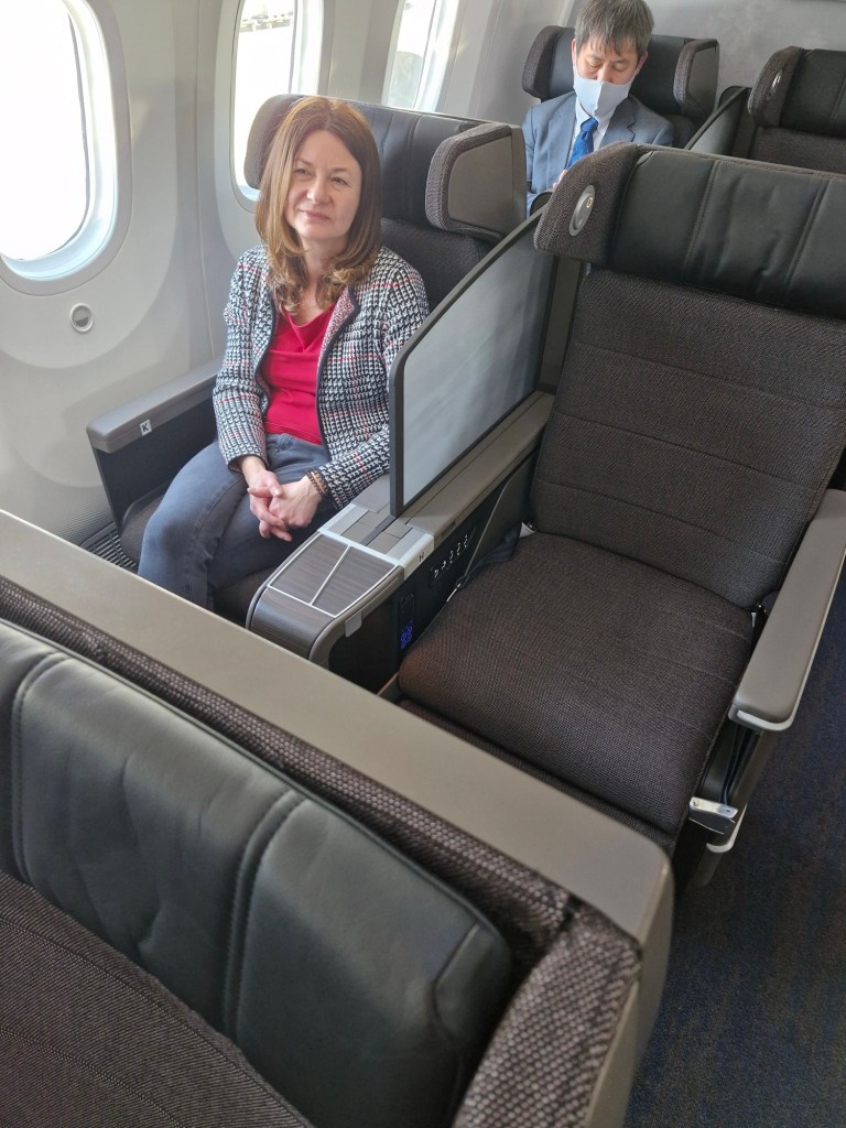Nach dem Boarding; ein kurzer Gruß aus der ANA Premium Class mit viel Platz, lecker Essen und Trinken und auf einem Inlandsflug mit Filmen in deutscher Sprache.