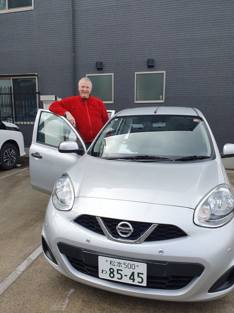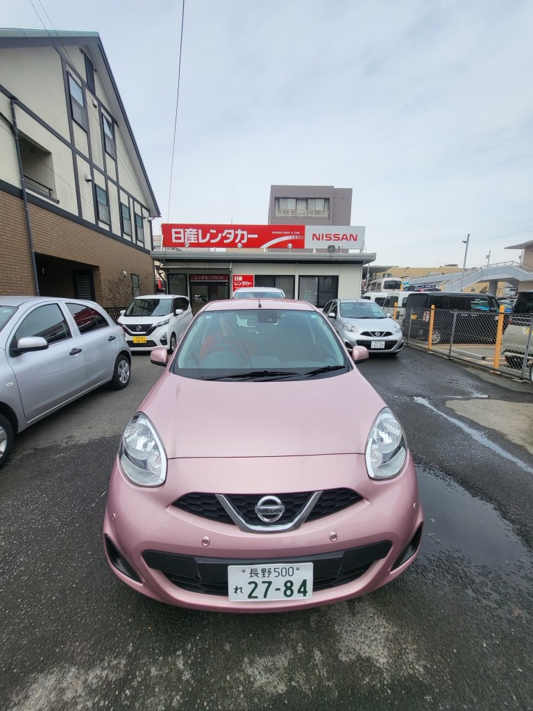Nach einem top Frühstück (international und japanisch) suchten wir kurz den Bahnhof auf und buchten bereits die Tickets (Nagano-Tokyo) die wir in einigen Tagen erst brauchen und machten uns dann zur nahe gelegenen „Nissan Rent a Car“ Nagano Station auf. Dort wartete ein Nissan March auf uns. Für 6 Tage hatte ich bereits in D bei Check24 für 274€ zugeschlagen. Da ich alle nötigen Unterlagen aus unserer vorherigen Japan Trips schon hatte und ich dort registriert bin, ging alles recht schnell und bereits nach 30 Minuten brausten wir mit unserem rosa Mobil (Plethi meint, ich soll besser Farbe „Kirschblüte“ sagen) davon.