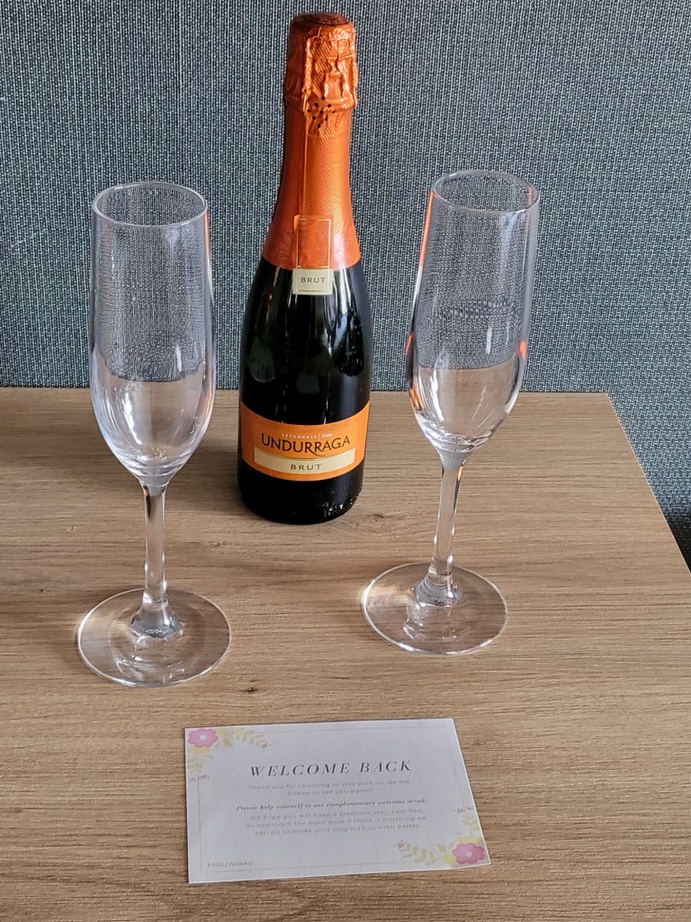 Am nächsten Morgen ging es dann innerhalb des Flughafens zum NDS (Niseko Direkt Shuttle) und 30 Minuten später saßen wir bereits in einem Reisebus, der uns in 2,5 Stunden durch die Bergwelt Hokkaidos zum Skiort Niseko brachte. Am Niseko Wellcome Center mußten wir 10 Minuten warten bis unser Transfer zum Miru Niseko Hotel (https://mirucollection.com oder einfach bei booking.com) erfolgte. Auf unserem Zimmer erwarte uns als Stammgast noch eine nette Überraschung,