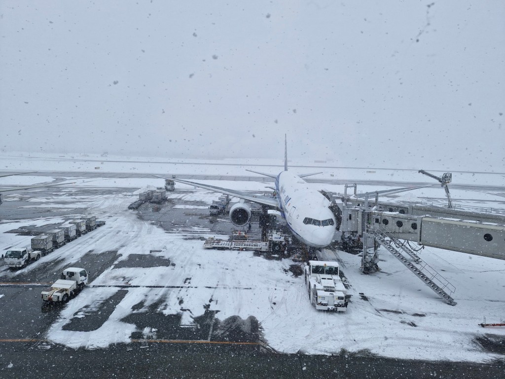 Sie kam erst einmal nicht und so suchten wir, den CheckInn Schalter der ANA für unseren Flug nach Tokyo auf. Mir war schon etwas mulmig, als dort nichts los war und wir nach kurzer Wartezeit vor einer netten Damen standen und unsere Pässe präsentierten und kund taten, dass wir uns in den ANA Flug 056 nach Tokyo einbuchen wollten. In meinem Rücken gab es eine große Fensterfläche mit Blick auf das Rollfeld oder besser gesagt, eine Schneewand, die dort gerade alles weiß färbte und vor mir, eine lächelnde Angestellte, die uns fröhlich einbuchte und meinem Wunsch nach einem Upgrade in die Business Klasse mit einem wohlwollenden Lächeln als machbar quittierte. Zücken – zahlen – freundlich sein, wir zahlten ein Aufgeld i.H. von 15.000 Jen (90€) pro Person und so langsam begann ich zu hoffen, dass der japanische Wettergott es doch mit uns gut meinen würde. Als wir dann die Lounge enterten klärte sich langsam das Wetter auf und wir schauten zu, wie unser Flugzeug eisfrei und flugtauglich gemacht wurde.