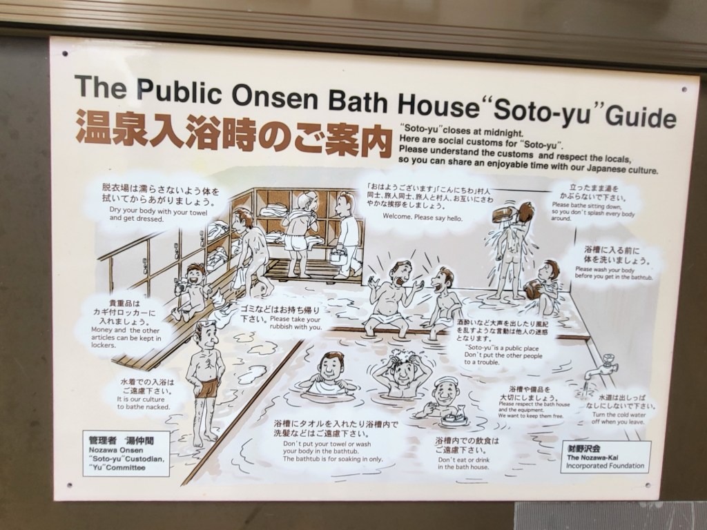 Bevor es zu den Bildern geht noch ein paar Worte zu den Baderegeln. Die Tätigkeit des Badens wird hier onsen genannt. Der Ort dieser Tätigkeit ist der Onsen. Hierbei handelt es sich um ein strikt nach 2 Geschlechtern (es gibt in Japan nicht mehr!) getrenntes öffentliches Badehaus. Hier in Nazawa Osen (der Ort) brodelt die Erde und es gibt 13 kostenlose öffentliche Onsen, 3 öffentliche Bezahlonsen und zig, den jeweiligen Hotelgästen vorbehaltene Privatonsen.