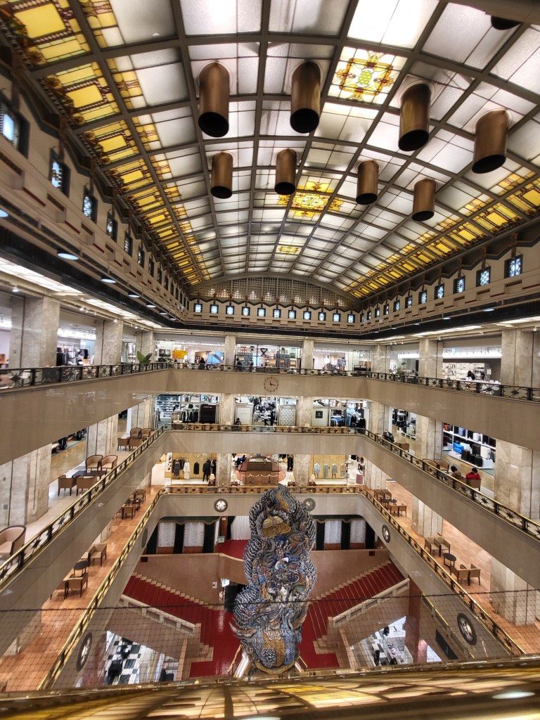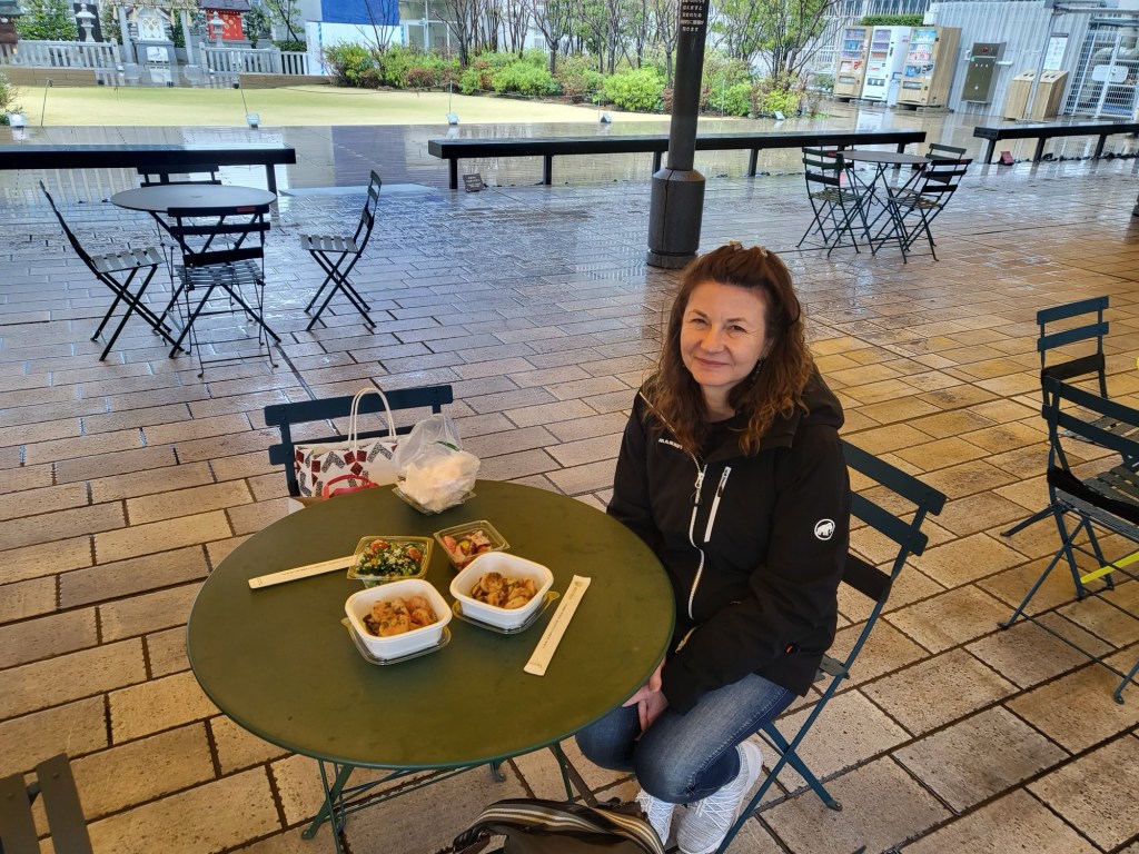Unsere letzten Tagen in Japan nutzen wir auch dazu, uns richtig auszuruhen. Wir liegen meist vor 22:00 im Bett und der Wecker geht nicht vor 7:00 in der früh. Heute war der erste so richtige 100% Regentag während unseres Urlaubs. So ausgeruht ging es deshalb auf die Kaufhaustour. Wir bewegten uns größtenteils mittels U-Bahn von einem Kaufhaus zum nächsten. Highlight war hierbei die erste Adresse in Tokyo, sozusagen das Herolds von Asien. Dieser Konsumtempel ist das Mitsukoshi. Hier findet man jegliche Nobelmarke und im Kellergeschoß eine Foodabteilung, deren Besuch sich in jedem Fall lohnt. Wer hier am späten Nachmittag vorbeischaut, kann so manches kulinarische Schnäppchen machen. Wir waren vormittags dort und nach einem Beutezug fanden wir ein ruhiges Plätzchen auf der Dachterrasse.