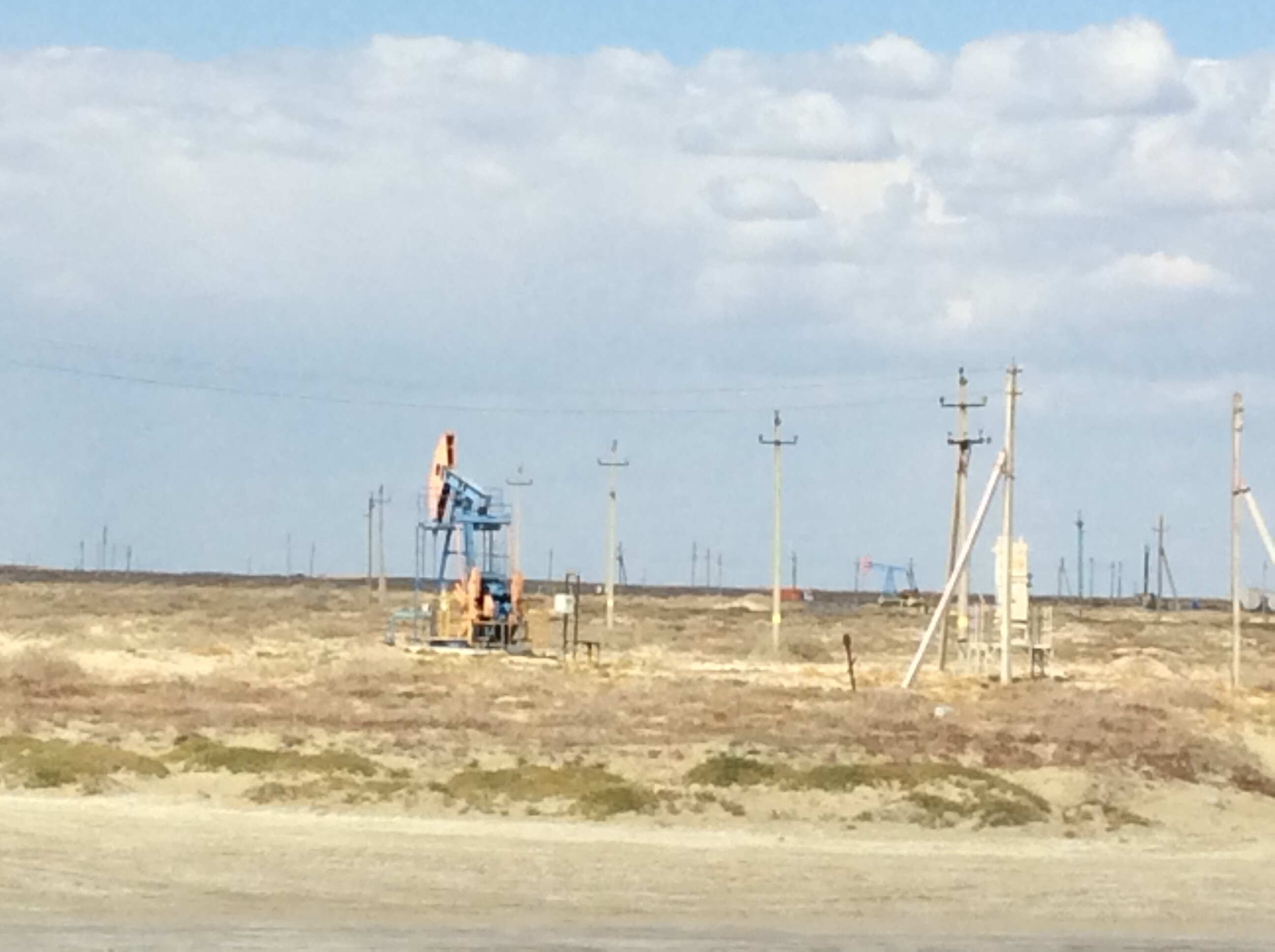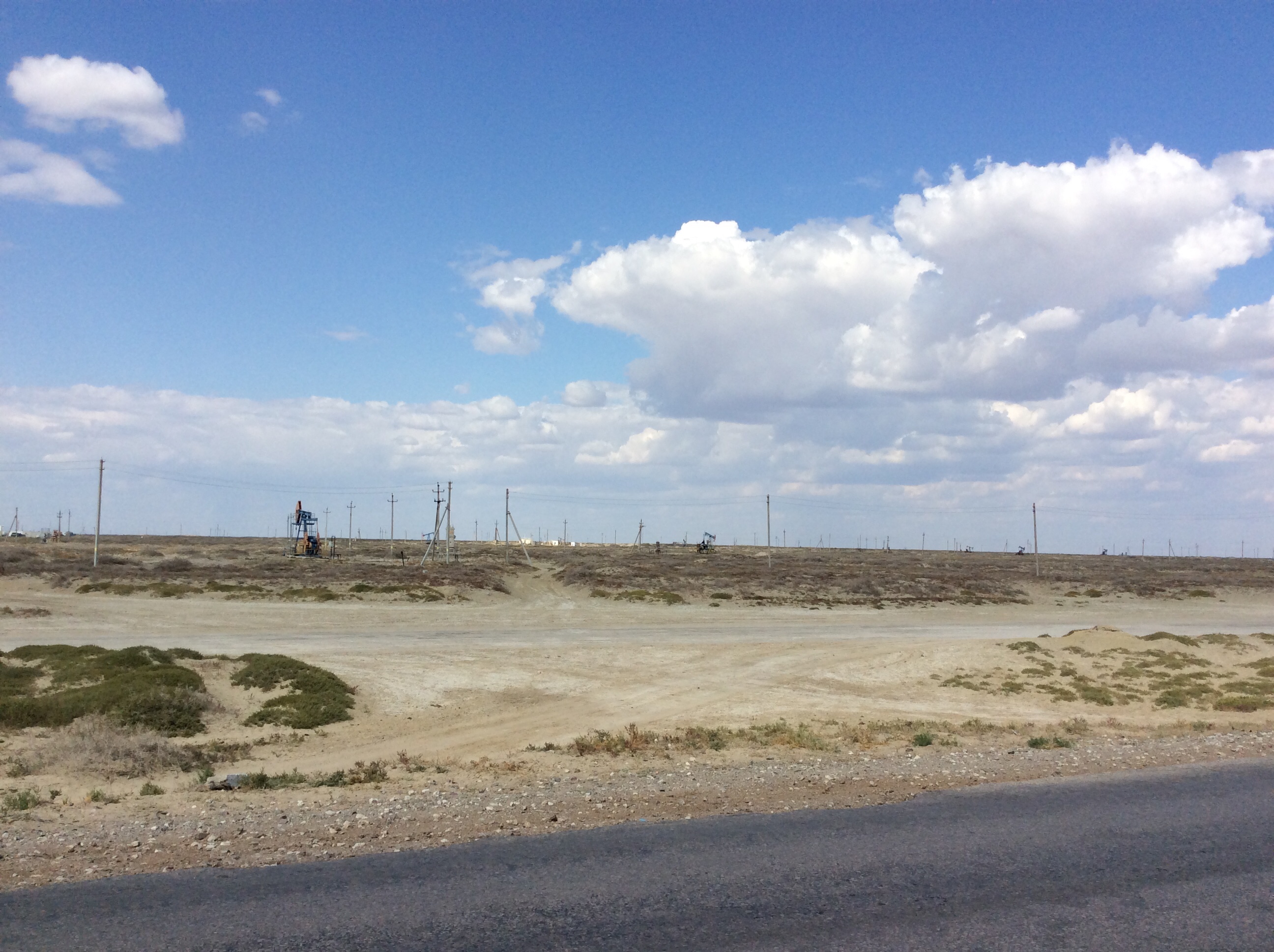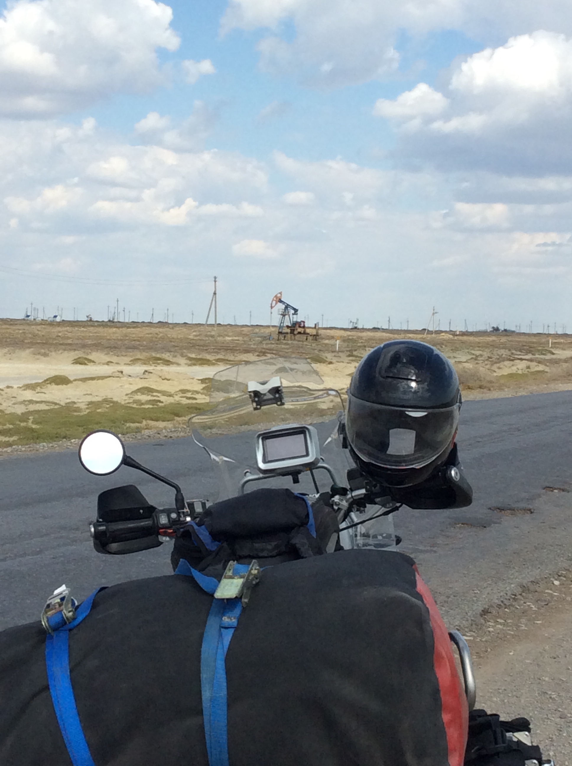 Plattes Land, Steppe halt so weit das Auge reicht. Bei Atyrau, dachte ich unwillkürlich an die Fernsehserie Dallas. Ölförderung soweit das Auge reicht. Dazwischen dann Pferdeherden und Kamele🐪 🐫 mitten auf der Straße. Es waren die mit den zwei Höckern :-). Mehr Fotos gibt es leider nicht, denn die Straße war in einem sehr schlechten Zustand. Ich mußte höllisch aufpassen. Dazwischen dann noch ein kleiner Sandsturm und Gewitter. Normal trage ich meine Motorradhose in den Stiefeln. Dann wird sie nicht so schmutzig im unteren Bereich. Wenn es dann regnet, muss der Hosenbeinabschluß raus aus dem Stiefel. Warum? Sonst läuft das ganze Wasser über das Hosenbein in den Schuh. Diesmal ging es aber so schnell und es war so viel, dass ein Stiefel geflutet wurde.