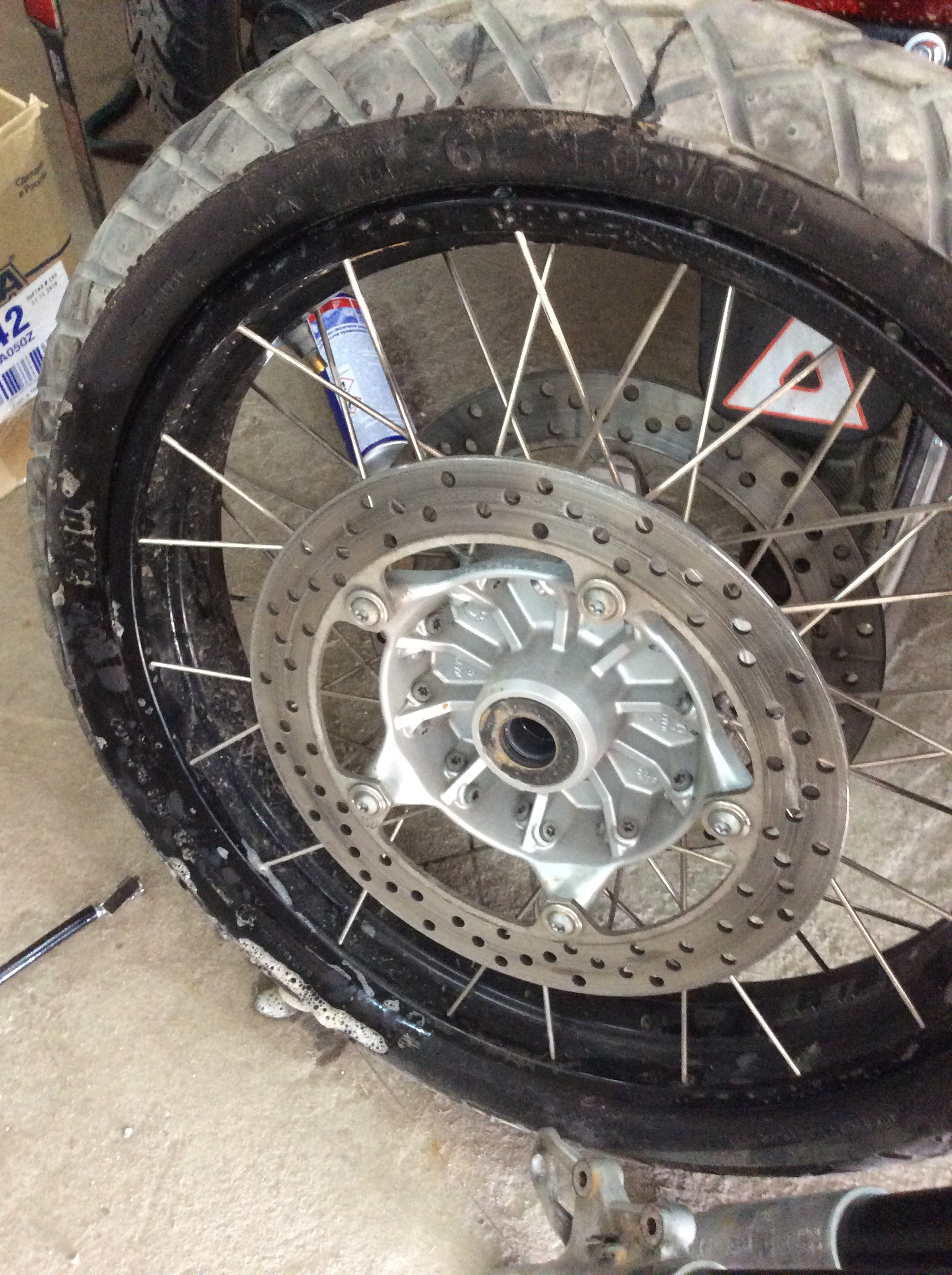 Die Gabelbrücke ist gerissen, das Cockpit zerstört und an einem Gabelholm ist zum Glück nur die Endschraube schief. Am meisten Sorgen bereitet mir aber die Felge bzw. der Vorderradreifen.