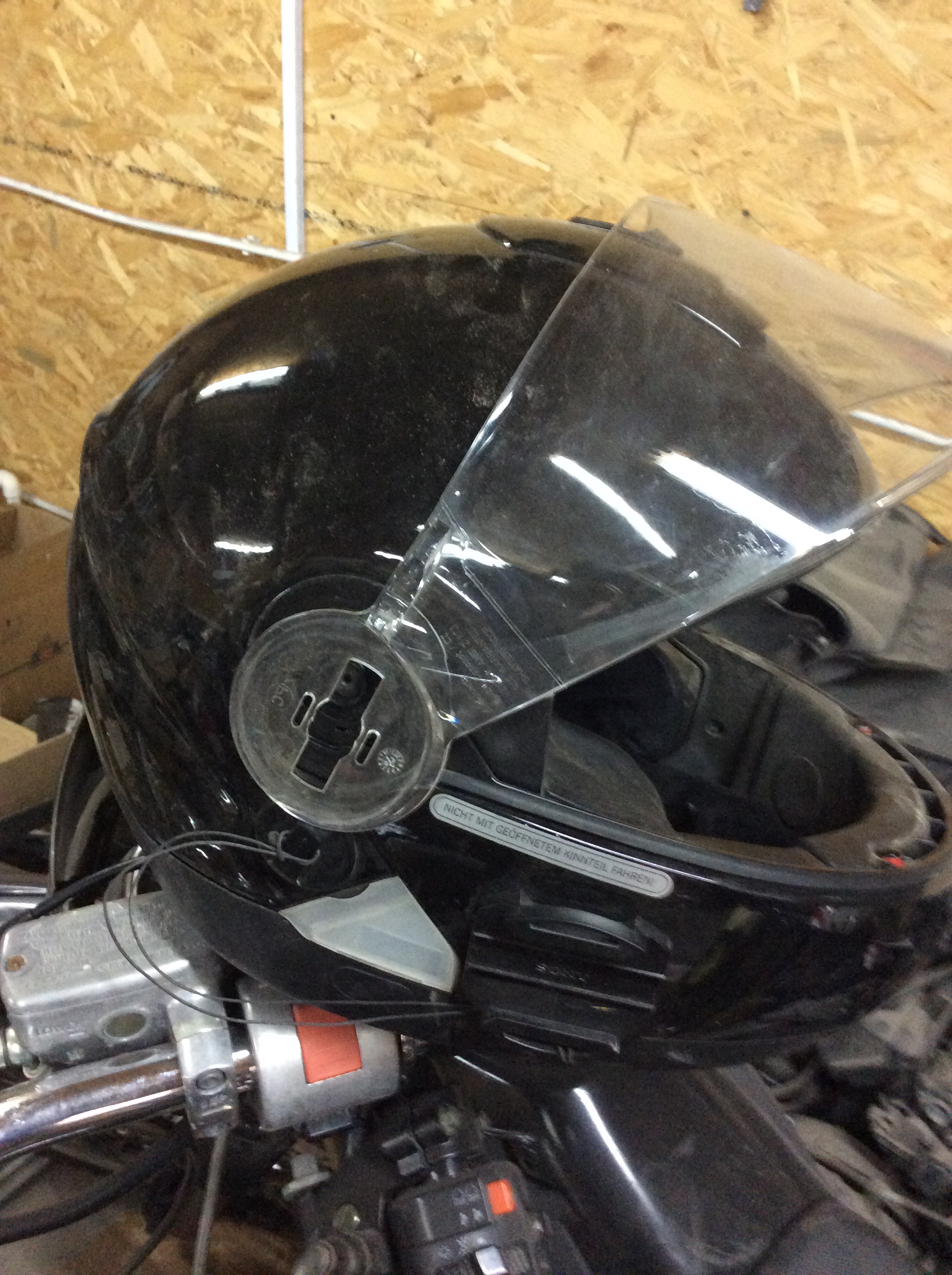 Aber wir haben noch ein zweites Problem. Mein Helm. Eine Visierbefestigung hat sich beim Unfall gelöst und auf nimmer Wiedersehen verabschiedet. Somit hält das Visier nicht mehr richtig und ich brauche Ersatz. Dieses gibt es wahrscheinlich nur in Moskau. Ich habe Kirill Bilder und eine Anschrift per Facebook gepostet. Ich hoffe, er kümmert sich darum. Ansonsten muss es ein Klebeband sein.