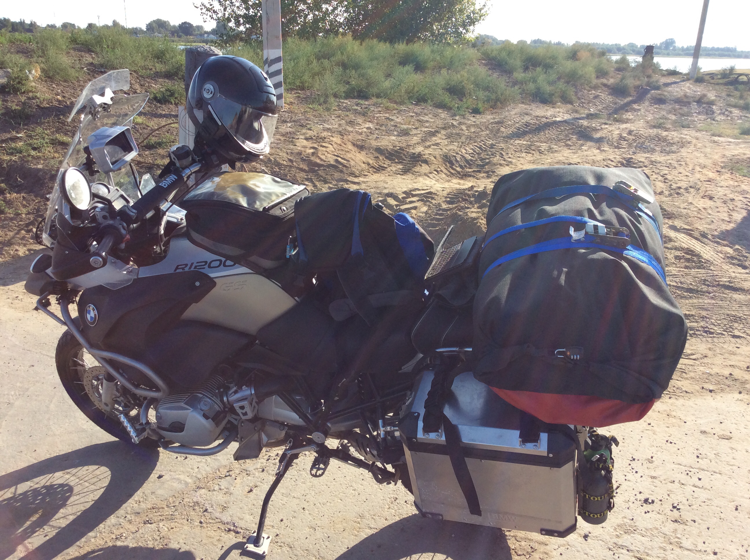 Gegen 15:00 kurz vor dem anvisierten Tankstopp passiert dann das erste Missgeschick. Beim überqueren einer großen Kreuzung mit Bodenwelle verzögert die 🐮 plötzlich und ein sirrendes Geräusch liegt in der Luft. Bitte nicht der Kardan!!! Ich schaffe es noch fast bis zum Straßenrand und halb auf der Kreuzung stehend schaue ich nach dem möglichen Schaden. Es ist wieder die Abdeckung vom Hinterrad. Genau wie damals in der Türkei. Sie hatte sich gelöst und zwischen Reifen und Aufhängung verkeilt. Das Problem ist lösbar. Ich entferne das Teil, kontrolliere den Hinterreifen auf Beschädigung und weiter geht es. Kurz darauf der nächste Ärger. Eine Polizeikontrolle. Ich wurde gezielt rausgefischt. Was hatte ich verbrochen? Kurz gesagt auch im Nachhinein kann ich es nicht sagen. Der ganze Vorgang ereignete sich wie folgt: Angehalten, Pass zeigen, Aufforderung zum Absteigen, in ein Polizeiauto geleitet, dort frage jemand etwas was ich nicht verstehen wollte und als dem das dann zu viel Aufwand wurde und ich gesichtswahrend die letzte Frage bezüglich Russland mit, ich mag Russland beantwortete, war ich entlassen und durfte weiterfahren.