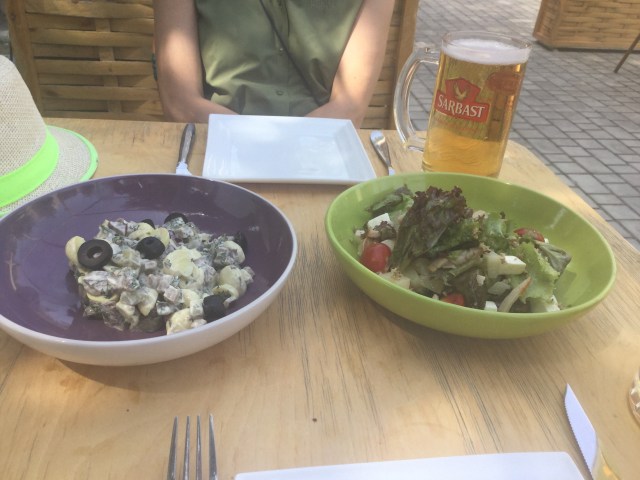 1/2 Liter eiskaltes Bier, 5000 Som, 40 Cent. Es blieb nie bei einem Gläschen Wir beginnen mit Salätchen und mittelgroßen Kebabspießen. die sehen nicht nur so aus, die waren riesig. Rind und Huhn