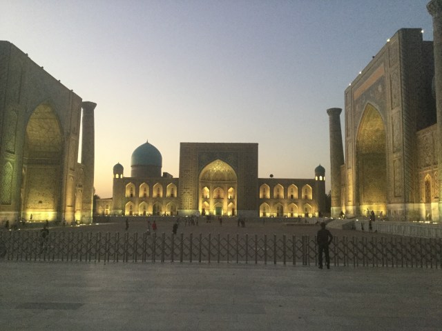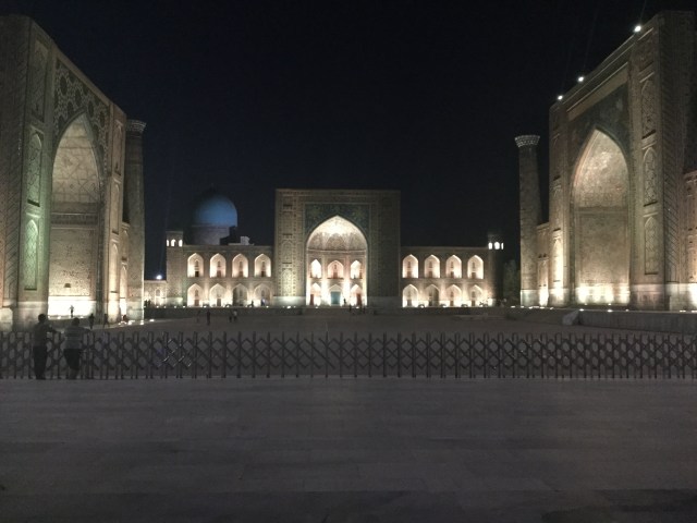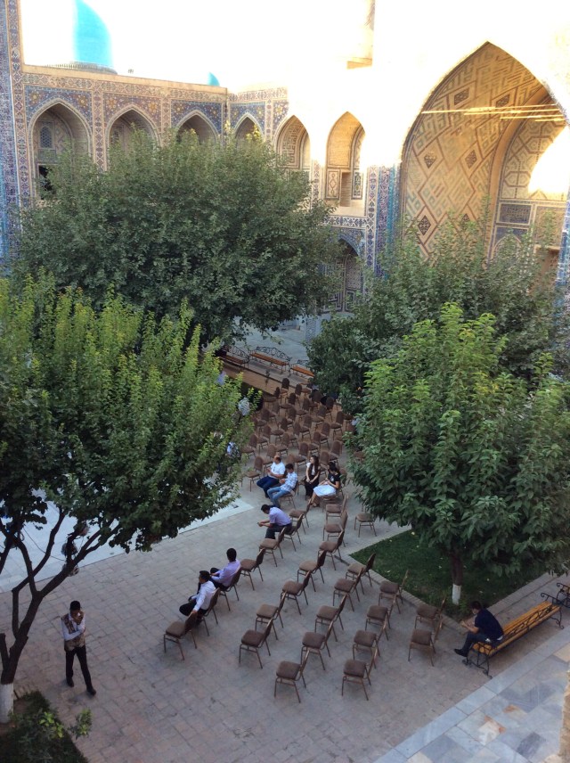 Wir haben in dieser Zeit etliche Kilometer zurückgelegt. Allein die verschiedenen Farben beim Registan, morgens, mittags und abends sind faszinierend. Der gesamte Komplex ist gut erhalten und nach einem bescheidenen Eintritt von 40.000 Som, 3,20€ haben wir etliche Stunden auf dem Gelände verbracht. Ein Highlight hierbei war ein Konzert innerhalb des Gebäudes. Von „der Barbier von Sevilla“ bis zu regionalen Liedern war alles dabei.