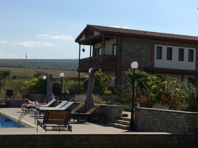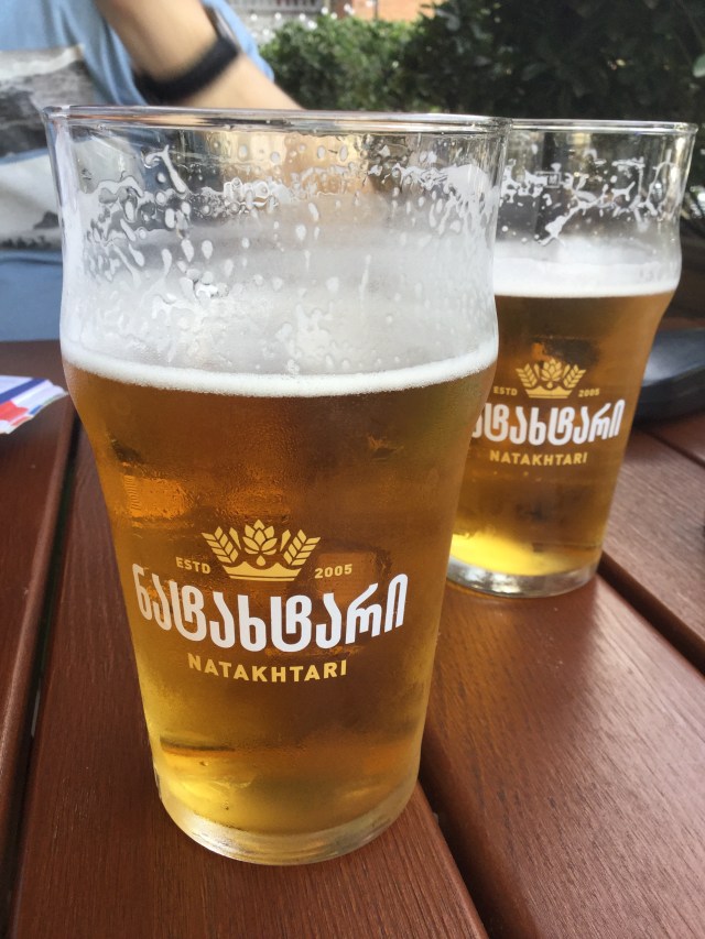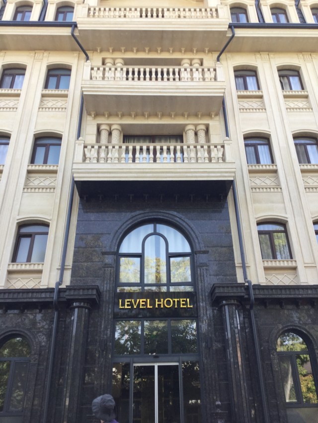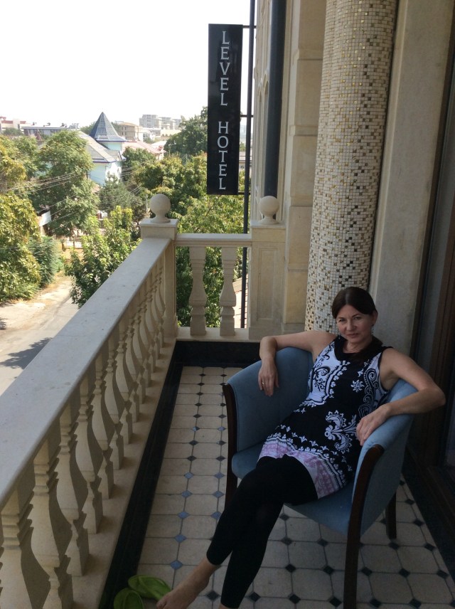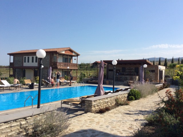 Im Chaos der Gepäckhalle fand ich nach einigem suchen unser Gepäck und O-Wunder, unser Fahrer wartete seit 2 Stunden auf uns. Nach einer wunderschönen und kurvenreichen Fahrt (1,5 Stunden, aber versorgt mit Wasser) durch den Vorkaukasus, kamen wir dann glücklich an unserem Weingut, dem Chateau Mosmieri (zu finden bei booking.com) an. Erst jetzt merkte ich, dass es Dani nicht gut geht. Zur Begrüßung fütterte Sie erst einmal ein Blumenbeet und musste sich etwas hinlegen. Im Plov-Olymp ist ihr wahrscheinlich ein böser Geist begegnet. Den Rest des Abends verbrachten wir auf dem Weingut und gingen recht früh schlafen. Die Nacht war dann für Dani nicht gut. Montezuma schaute diesmal bei ihr vorbei.