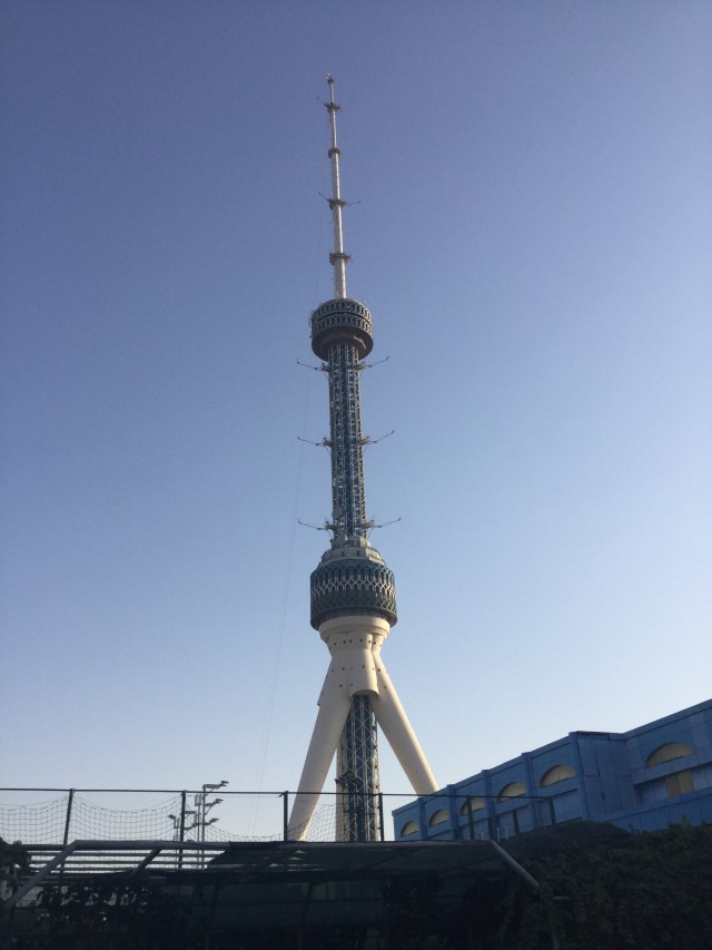 Hauptsächlich wollten wir das ultimative Plov-Universum finden. Den Tempel, wo dieses Nationalgericht zelebriert und verkostet wird. Wir hatten da auch so unsere Idee. Der Reiseführer nannte das “Plov-Kaffee” als die ideale Adresse. Wir also einen privaten Taxifahrer angehalten und ihn entsprechend instruiert. Es zeigte sich dann schnell, dass dieses unsere Wünsche verstand, nur über den Ort gab es Uneinigkeit. Wir fuhren los und ich konnte dank MapsMe die Strecke recht gut nachvollziehen. Alles lief prima, wir waren auf dem richtigen Weg. Kurz vor dem Ziel bog der Fahrer jedoch falsch ab, meine gestikulierten Einwände ignorierte er. So ging es bis an den Stadtrand. Wir hatten kapituliert und überlegten uns schon wie wir den Rückweg gestalten sollten. Dann plötzlich hielt er unmittelbar am riesigen Funkturm der Stadt an. Wenigsten noch ein schönes Bild, dachte ich so bei mir.