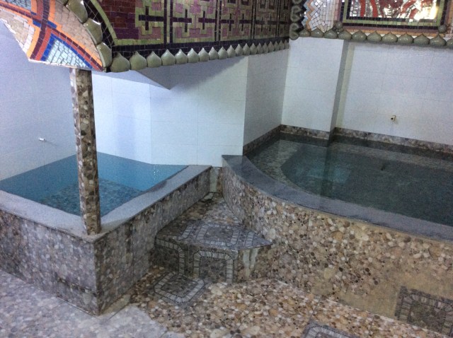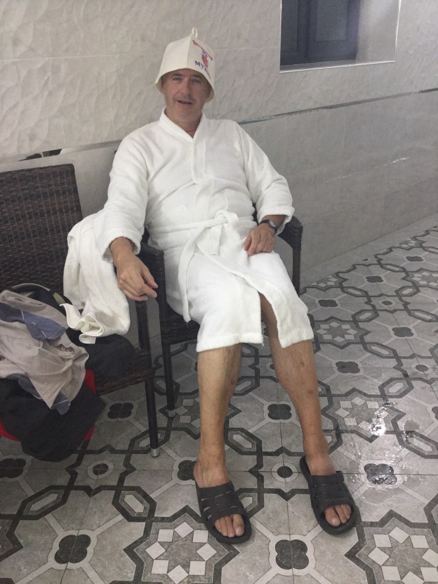 Dort und davon gibt es leider kein Bild, sausten wir an Seilen befestigt über ein Tal. Im Reiseführer fand ich einen Hinweis auf die Thermalbäder hier in Tiflis. Klar, dass sollte unser Abschluß werden, wir haben uns deshalb im städtischen Bad einen private Bereich (sonst ist es nach Männlein und Weiblein getrennt) genommen. Bei Tee wurden wir erst einmal richtig eingeseift, durchgeknetet und abgerubbelt. Danach ging es in die einzelnen Thermalbecken. Es roch nach Schwefel und ich dachte sofort an Aachen. Das Wasser war in einem Becken glühend heiß, mein Bademeister goss es mir über den abklingenden Sonnenbrand. Ich habe noch jetzt Tränen in den Augen,wie schön können doch Abenteuer sein!