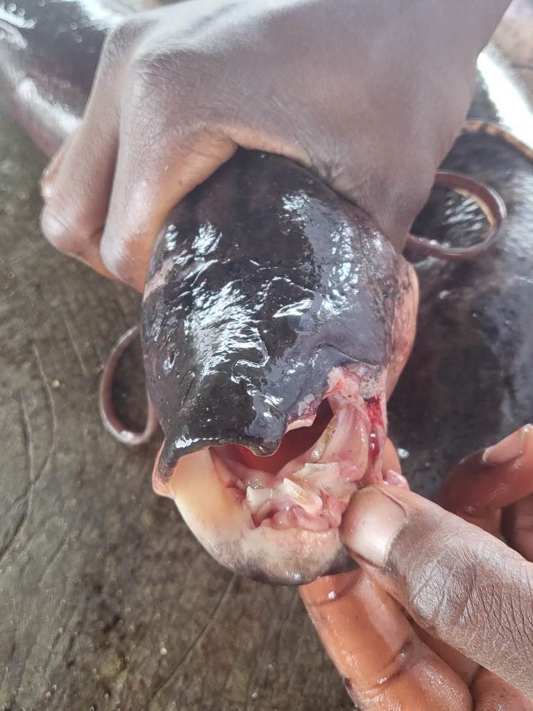 paar Bilder vom Fischmarkt (Ggaba Market at Lake Victoria) hier einstelle. Besonders wichtig war ihr, das Bild mit den Zähnen. Im übrigen, daß ist ein kleiner Fisch, ich will nicht dem Papa beim Schwimmen begegnen! Wobei, kein vernünftiger Mensch im Victoriasee freiwillig schwimmen geht. Nicht das Nilpferd oder das Nilkrokodil ist hier beileibe die größte Gefahr. Es ist mal wieder ein sehr kleines Getier mit dem der See hochgradig verseucht ist und das mit absoluter Sicherheit zuschlagen wird. Die Bilharziose! Aber bleiben wir lieber bei den schönen Dingen. Der Victoriasee, benannt nach der englischen Queen, ist ein sehr großes Binnengewässer, genauer gesagt, nach der Wasserfläche die Nummer 2. Besser kann man sich das mit einem Beispiel verdeutlichen. Ganz Bayern passt da rein oder die Insel Irland. Ca. 40 Millionen Menschen leben an seinen Ufern, das ist so etwa die halbe Einwohnerschaft Deutschlands. Für mich ist es daher ein Wunder, dass der See so klares Wasser hat (keine Kläranlagen) und ich war andererseits nicht erstaunt, wie sehr die Menschen hier darauf achten, kein Plastik in den See zu werfen. Jeden Tag werden Unmengen an Fisch aus diesem See gezogen und entweder als Victoriabarschfilet direkt exportiert oder wenn es sich um andere Fischarten handelt, dem heimischen Markt zugeführt.